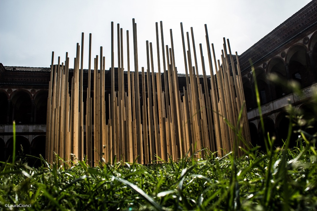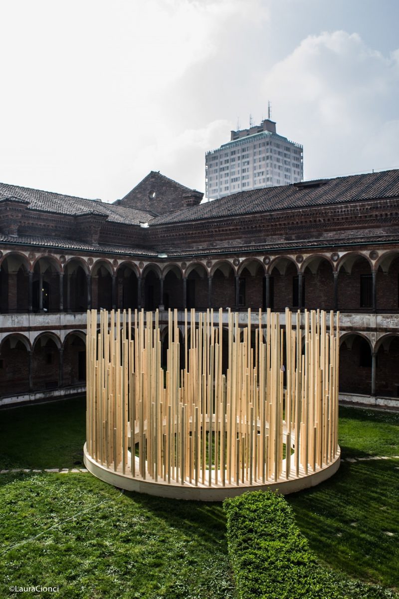 L’installazione, visitabile e accessibile liberamente per tutta la durata della Design Week nel prato centrale del Cortile della Farmacia presso l’Università Statale, è uno spazio circolare perimetrato da 350 colonne cilindriche in legno che raggiungono un’ altezza massima di 6 metri, con un diametro esterno di 10,5 metri ed uno interno di 7 metri; le colonne sono ancorate al suolo grazie a una pedana circolare in legno alta 45 centimetri, che diventa anche una seduta.