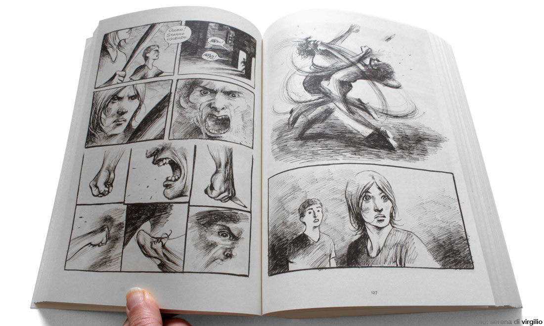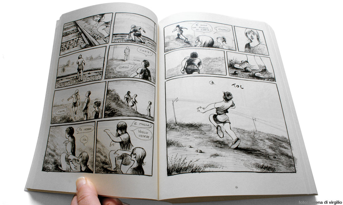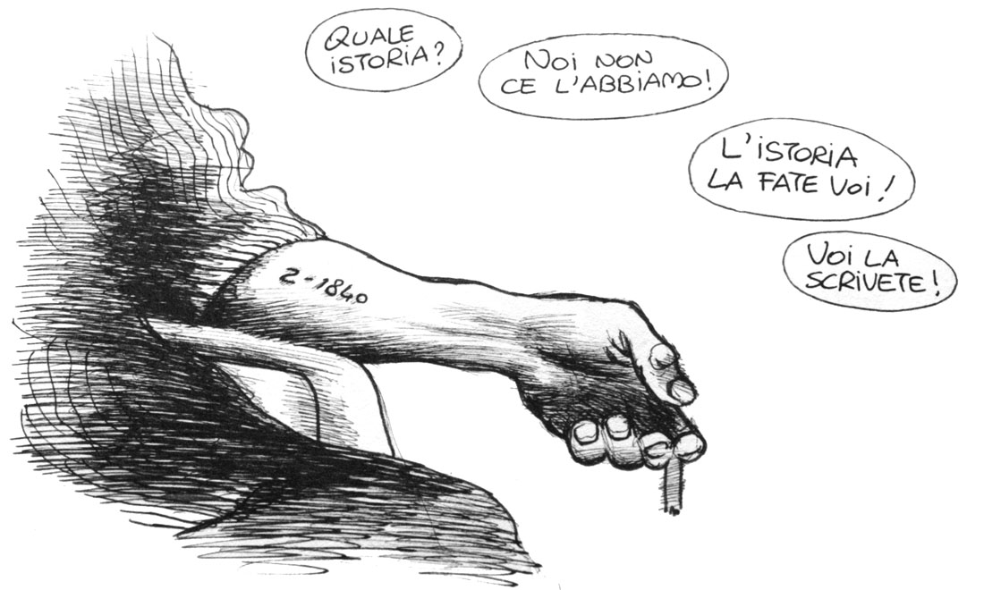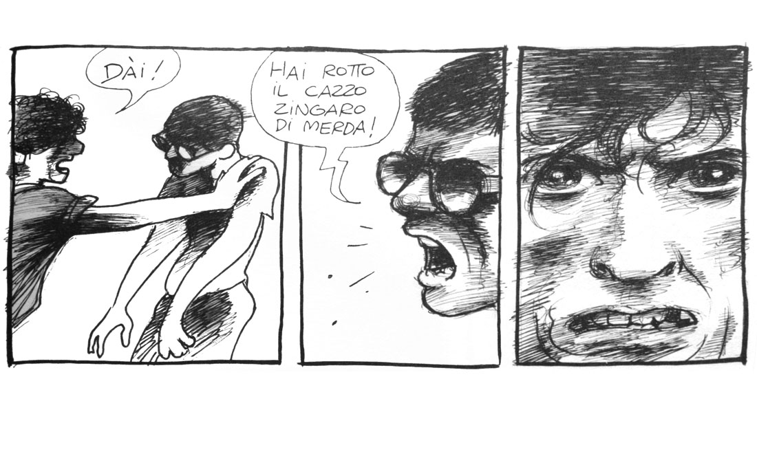 A fare da contraltare al giovane protagonista c’è quindi un sinti, che si inserisce nel racconto poco per volta, a cui Reviati fa raccontare la propria versione di certi ricordi di Guido e che lo richiama all’ordine quando abbellisce o divaga. Lucido, deciso ed eloquente laddove gli Stančič parlano poco e in un italiano grezzo (rappresentato da un lettering poco o per niente leggibile), quest’uomo appare come una versione idealizzata, matura e consapevole di un membro della famiglia. Fa da portavoce del proprio popolo, come nel capitolo che contrappone la memoria della persecuzione degli zingari alla banalità della storia nei libri di scuola. Ma a Reviati non sfugge che questo sinti sia scritto e disegnato da un italiano, e fa dire alla matrona “L’istoria la fate voi! Voi la scrivete!”.