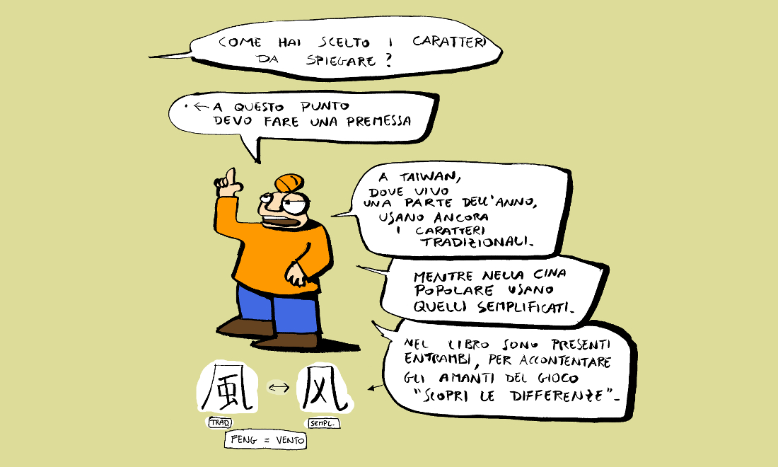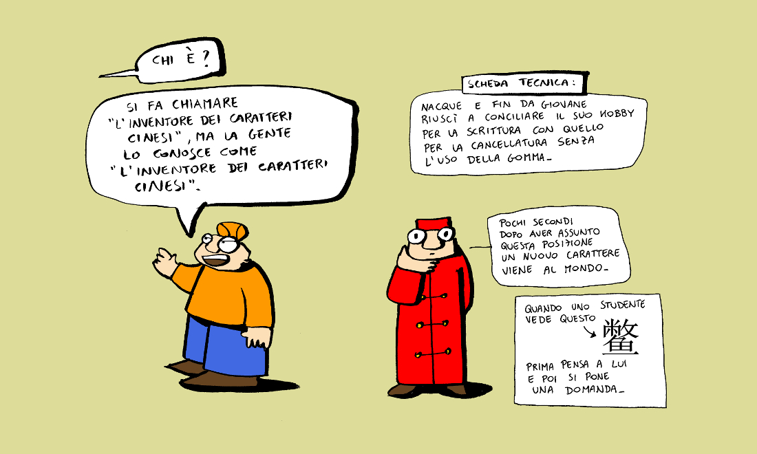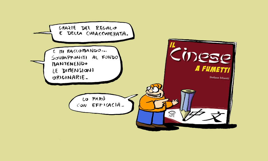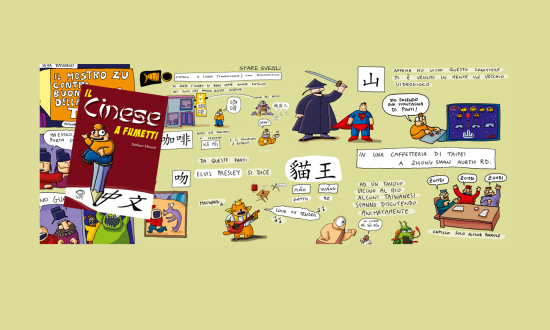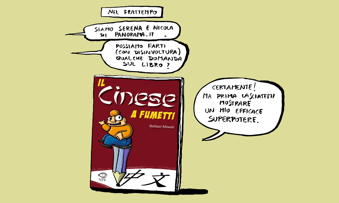 Abbiamo fatto qualche domanda a Stefano Misesti, e ci ha risposto disegnando. Il suo ultimo libro, “Il cinese a fumetti”, pubblicato da Nicola Pesce Editore, è un divertente compendio di basi di lingua cinese: a ciascuna parola e relativo carattere viene abbinata una piccola storia bizzarra per aiutare la memorizzazione.