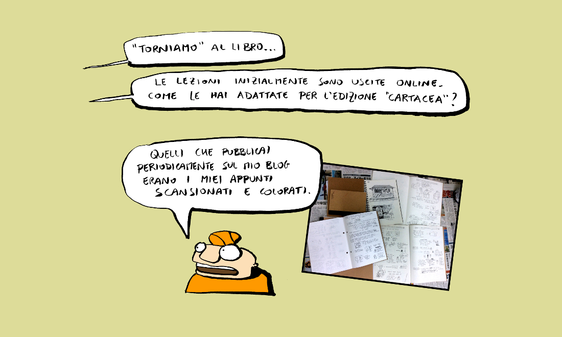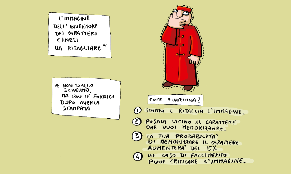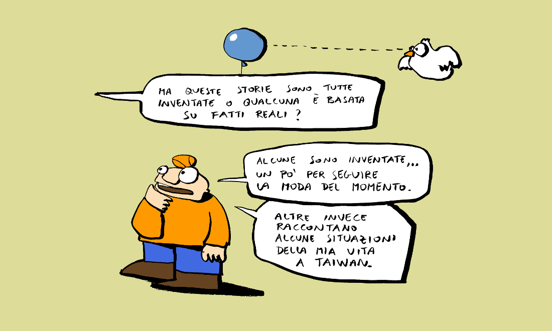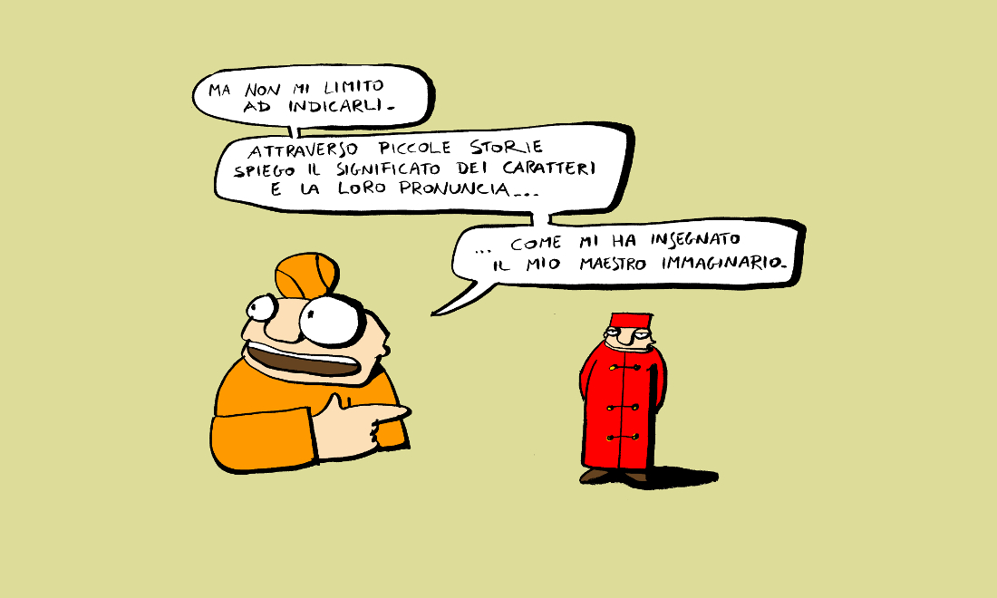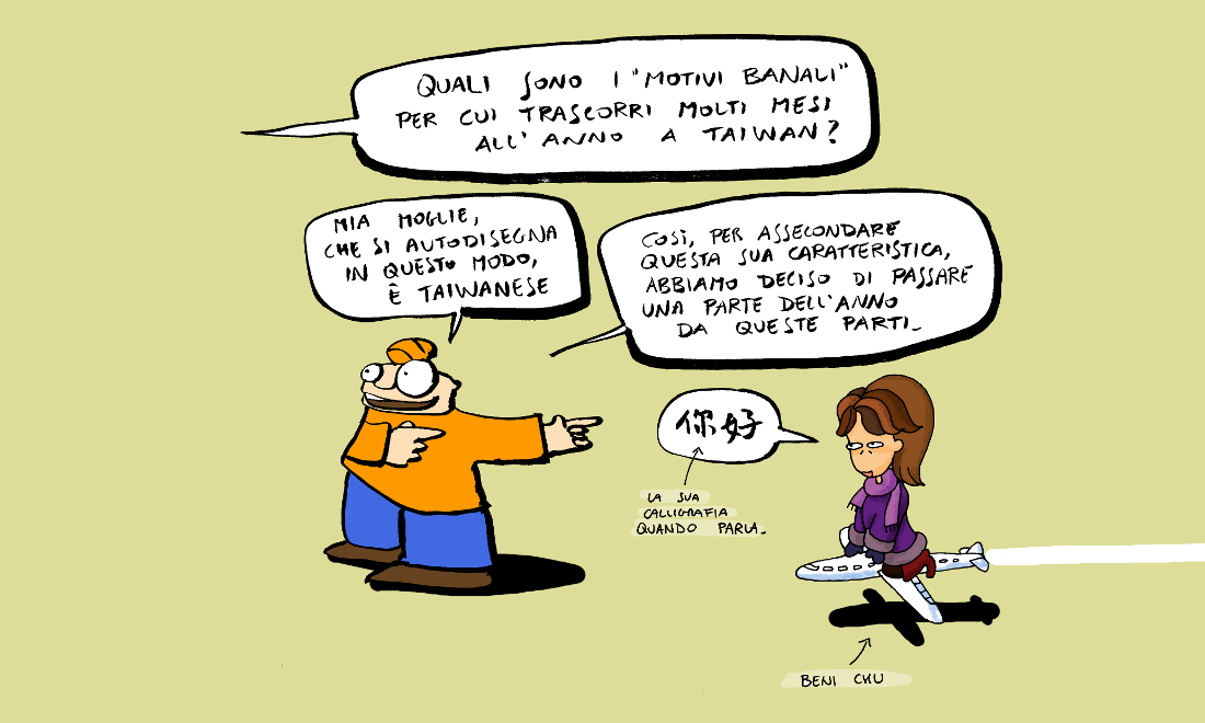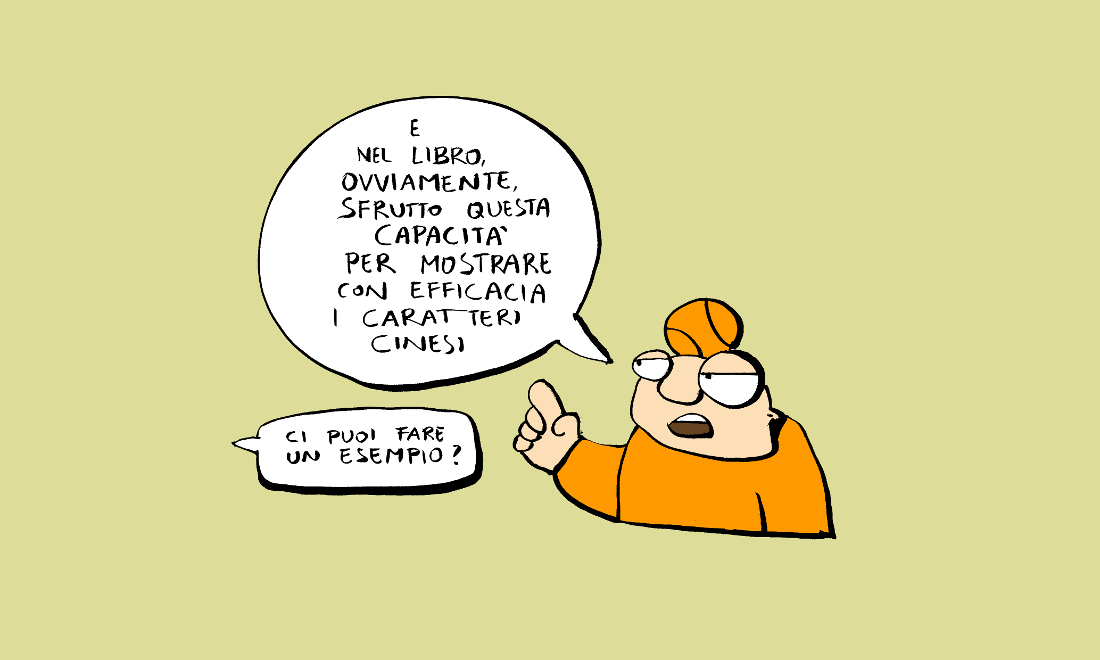 Abbiamo fatto qualche domanda a Stefano Misesti, e ci ha risposto disegnando. Il suo ultimo libro, “Il cinese a fumetti”, pubblicato da Nicola Pesce Editore, è un divertente compendio di basi di lingua cinese: a ciascuna parola e relativo carattere viene abbinata una piccola storia bizzarra per aiutare la memorizzazione.