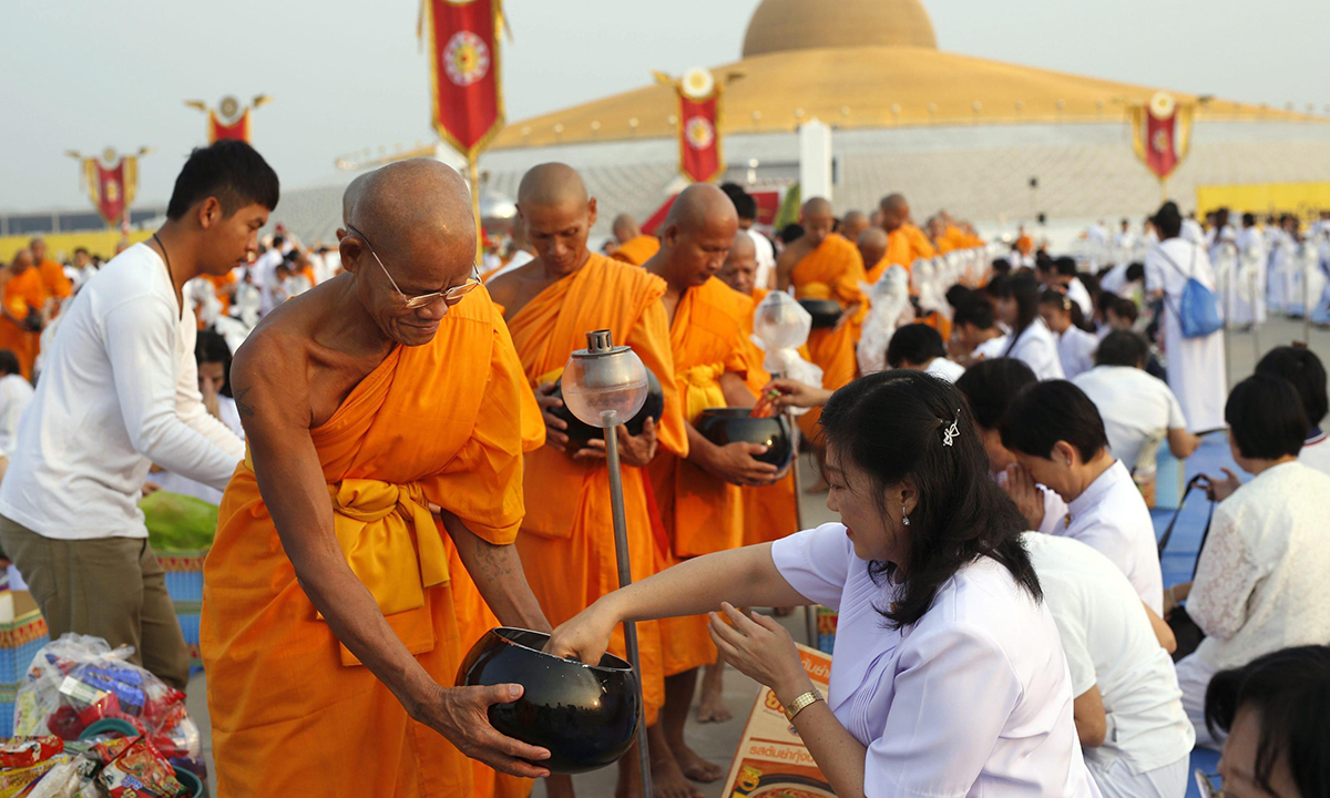 Tempio di Wat Phra Dhammakaya, provincia di Pathum Thani, periferia di Bangkok, Thailandia, 22 febbraio 2016. Celebrazioni per il giorno di Giorno di Magha Puja: monai buddhisti ricevono offerte dai fedeli.