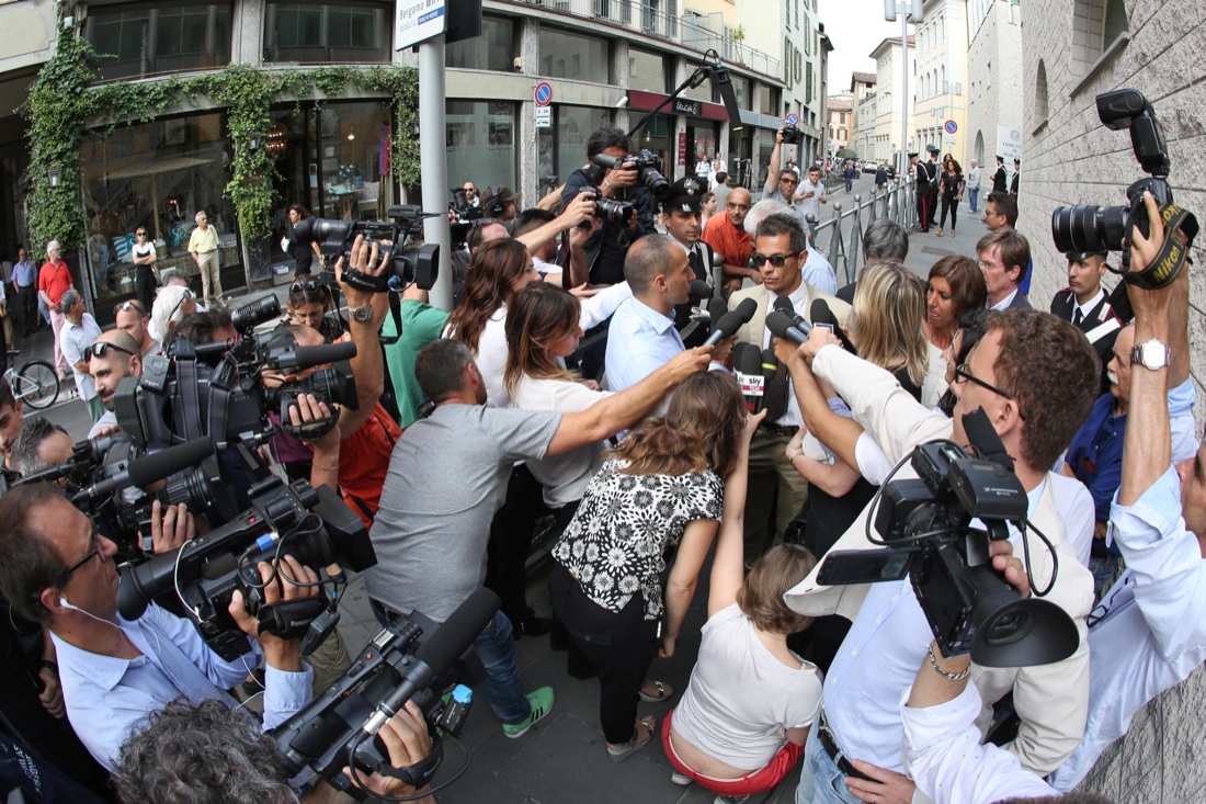 Giornalisti e curiosi all’esterno del tribunale in occasione dell’ultima udienza del processo a carico di Massimo Bossetti per il quale sarà emessa oggi la sentenza per l’omicidio di Yara Gambirasio, 1 luglio 2016