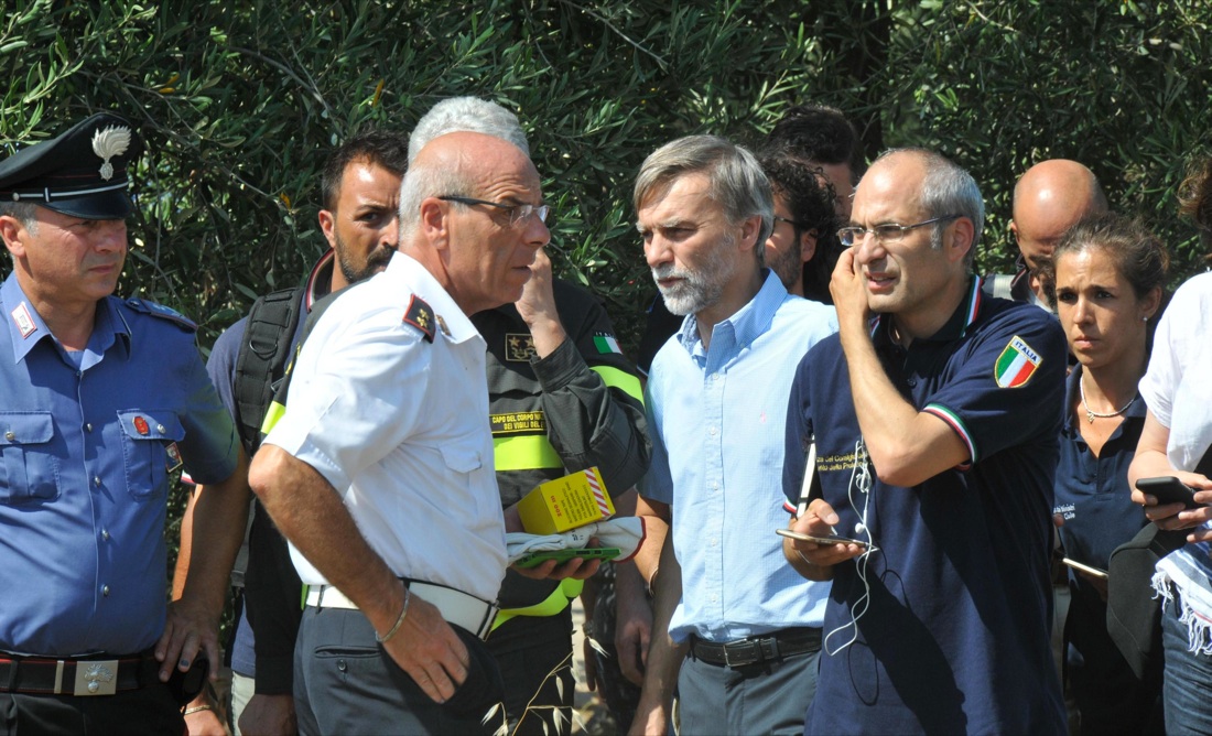 Il Ministro dei trasporti Graziano Delrio (al centro) con il capo della Protezione Civile Fabrizio Curcio (a destra) sul luogo dello scontro tra due treni tra Andria e Corato in Puglia – 12 luglio 2016