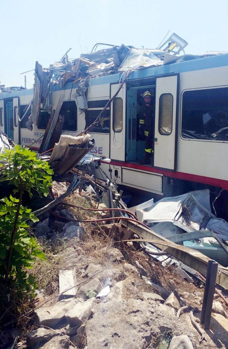 Soccorritori accanto ai treni coinvolti dallo scontro in Puglia, 12 luglio 2016