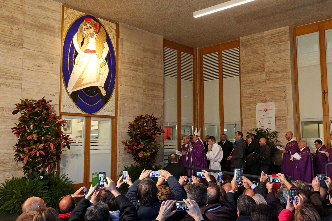 Papa Francesco ha aperto la Porta Santa della Carità nell’Ostello della Caritas diocesana “Don Luigi di Liegro”, in Via Marsala, vicino alla Stazione Termini di Roma. “È questa la porta del Signore”, ha detto il Papa nel rito di apertura sullo spazio antistante: “Apritemi le porte della giustizia”, quindi “Per la tua grande misericordia entrerò nella tua casa Signore”, ha aggiunto prima di spingere la porta, varcare la soglia sovrastata dal mosaico con l’icona del Giubileo ed entrare all’interno della mensa Caritas, dove ha celebrato la messa.