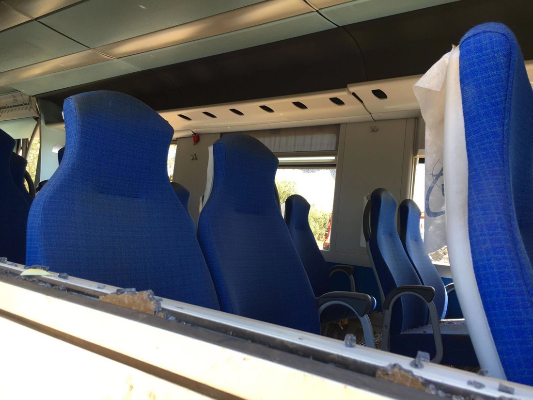 L’9nterno di un vagone coinvolto nello scontro tra due treni in Puglia.