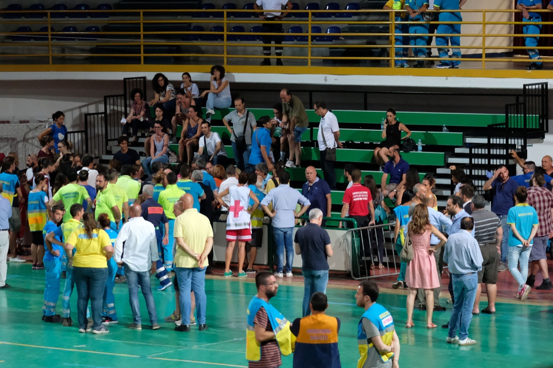 I familiari delle persone a bordo dei treni coinvolti nello scontro, radunati nel palasport di Andria in attesa di notizie, 12 luglio 2016