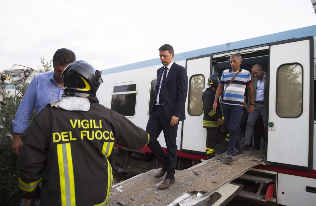Il premier italiano Matteo Renzi sul luogo dello scontro tra due treni in Puglia, 12 luglio 2016ANSA/ US/ PRESS OFFICE/ CHIGI’S PALACE/ TIBERIO BARCHIELLI +++ ANSA PROVIDES ACCESS TO THIS HANDOUT PHOTO TO BE USED SOLELY TO ILLUSTRATE NEWS REPORTING OR COMMENTARY ON THE FACTS OR EVENTS DEPICTED IN THIS IMAGE; NO ARCHIVING; NO LICENSING +++