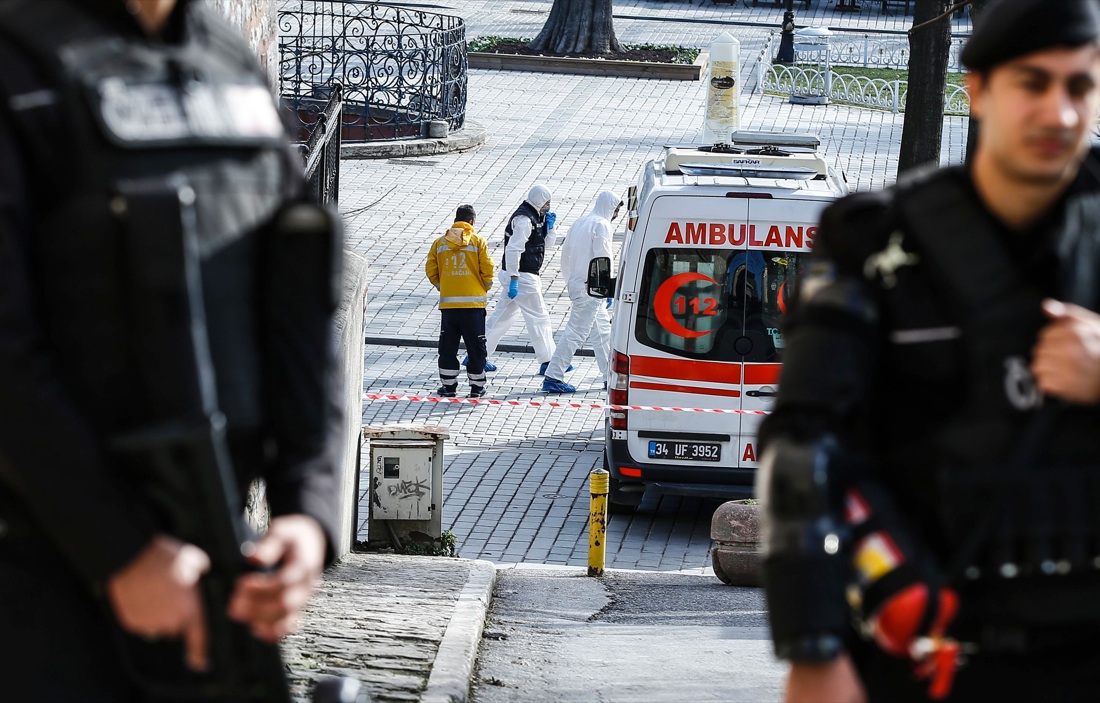 Forze di sicurezza turche sul luogo dell’esplosione della bomba vicino alla Moschea Blu di Istanbul – 12 gennaio 2016