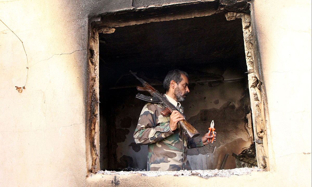 Bengasi, Libia, 23 febbraio 2016. Un combattente fedele al governo di Tobruk controlla un edificio distrutto, dopo la ripresa del controllo di parte della città costiera orientale dalle mani degli islamisti di ISIS.
