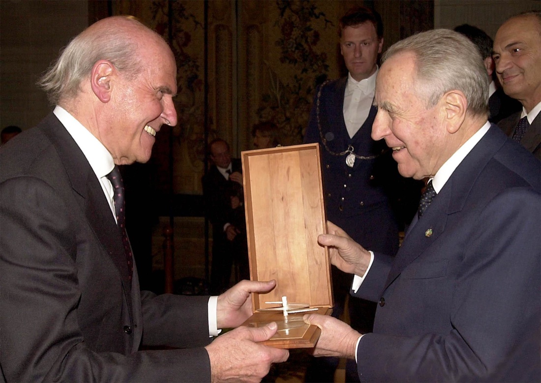 Il presidente della Repubblica Carlo Azeglio Ciampi consegna il “Premio Leonardo” al professore Umberto Veronesi, in una immagine del 13 dicembre 2001.