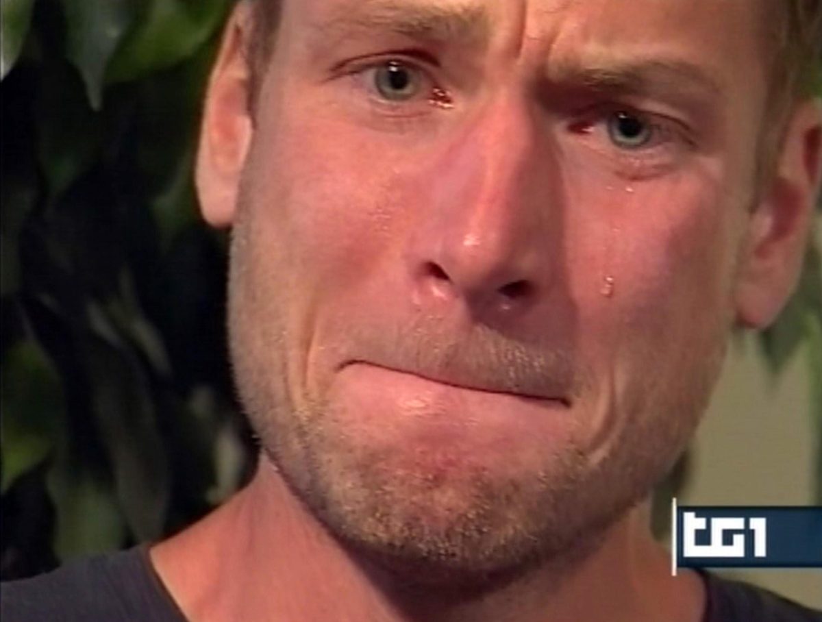 Alex Schwazer, medaglia d’oro a Pechino, durante la conferenza stampa in cui dichiara di aver fatto uso di sostanze dopanti nel 2012