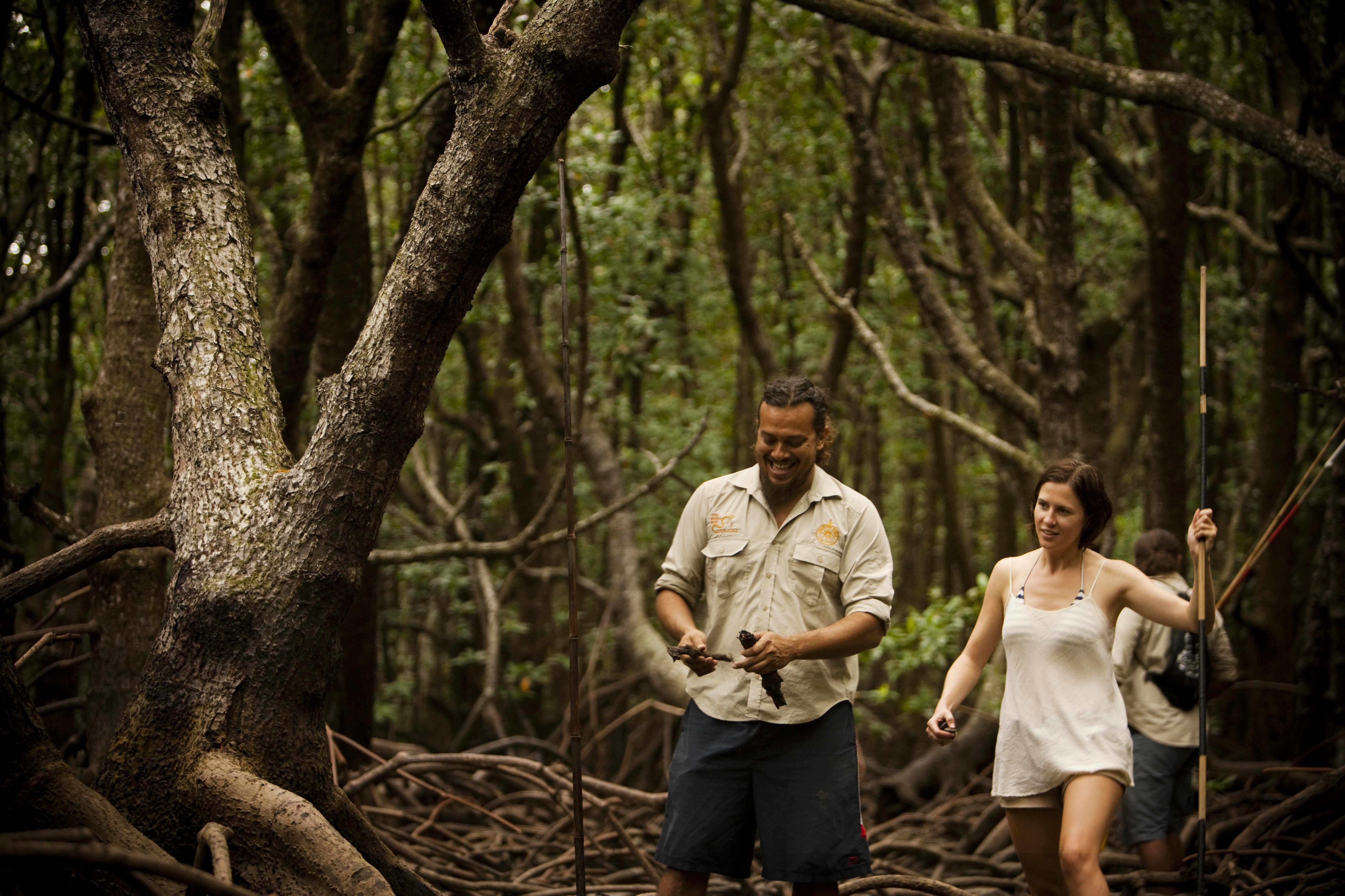 «Questo è il momento di togliersi le scarpe per procedere a piedi nudi ed entrare a contatto con la natura». Fra le più spettacolari esperienze da fare nel Queensland, che da sola vale il viaggio, c’è l’escursione fra le mangrovie con una vera guida aborigena del Walkabout cultural adventures. Ci si ferma all’imbocco della foresta, si lasciano le scarpe nel pulmino e si scopre come viveva la tribù Kuku Yalanji. Dopo essersi cosparsi di crema solare e repellente per insetti (tranquilli, chiunque organizzi un tour arrivata munito di tutti i prodotti necessari in caso di turisti sbadati), si parte per una passeggiata di pochi minuti. All’improvviso gli alberi si aprono e appare un panorama che sembra provenire da un altro pianeta: davanti agli occhi si estende a perdita d’occhio una spiaggia su cui si mescolano l’acqua salata dell’oceano e quella dolce del fiume. Sul bagnasciuga spuntano micro piantine che diventeranno mangrovie come quelle che ricoprono la costa. La sabbia è morbida, quasi paludosa e i piedi affondano (ecco perché non è meglio togliersi le scarpe) mentre ci si avvicina alle mangrovie in religioso silenzio. A terra si vedono piccoli granchi beige e azzurri, i buchini lasciati dai vermetti che si nutrono solo di sabbia, conchiglie di ogni tipo.
