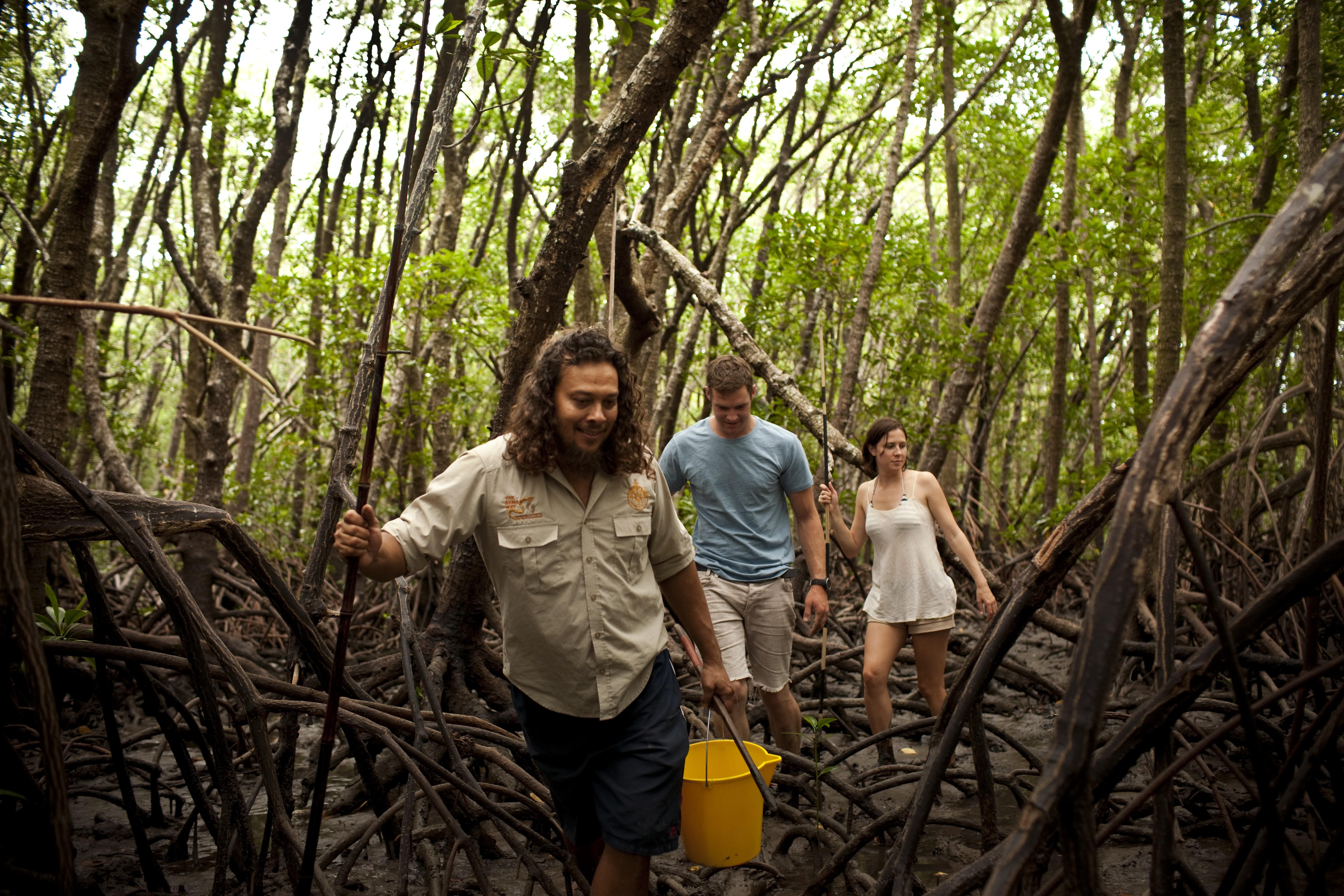 Nell’oceano, spiega la guida, si trovano le tartarughe che solo gli aborigeni possono cacciare e che tuttora sono il piatto principale per cerimonie come funerali e matrimoni. Tutti possono raccogliere crostacei sulla spiaggia, ma solo gli aborigeni possono catturare ciò che vive sotto le piante. Addentrarsi fra le mangrovie significa letteralmente «scalare» le loro radici aiutandosi con lance uguali a quelle usate millenni fa. Ogni tanto cade una foglia: le mangrovie per sopravvivere convogliano tutta l’acqua salata verso una singola foglia, che poi si ingiallisce e cade. Se il meccanismo si inceppa, la pianta muore.