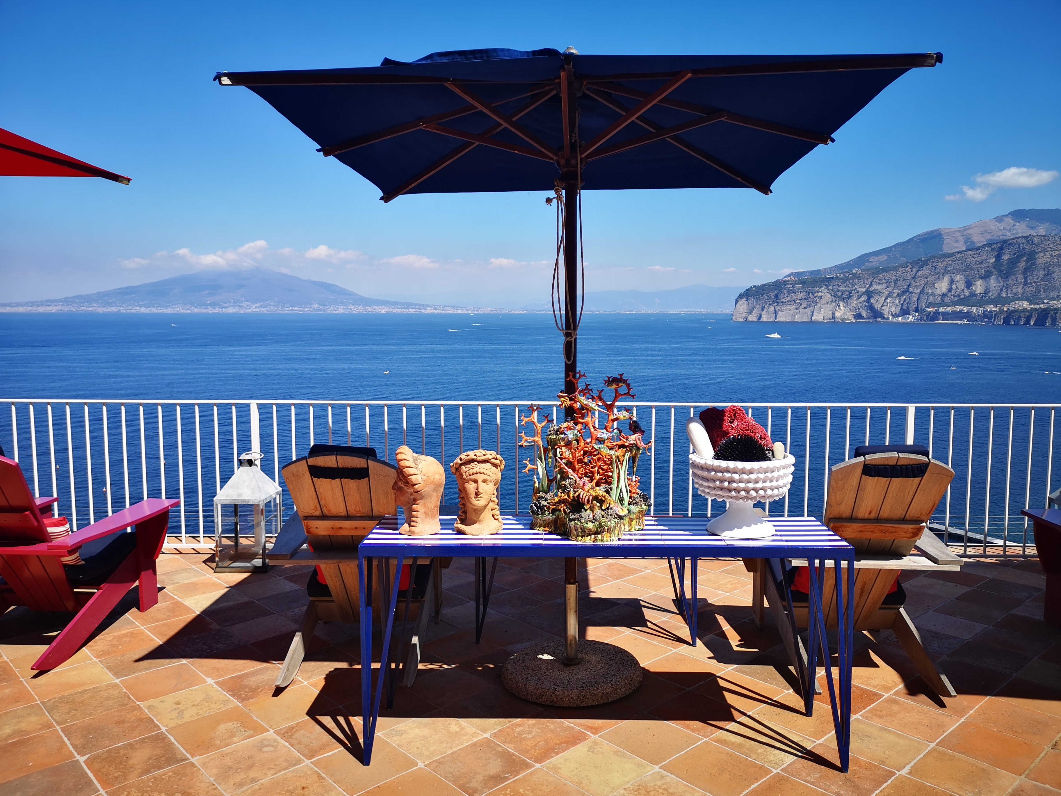 Design, arte contemporanea, storia e futuro convivono tenute insieme da quel senso di ospitalità che sa di casa e di amicizia, fin dal momento del check in. Una grande casa degli anni 50 con un enorme terrazzo dal quale si gode una delle più belle viste sul golfo, con il Vesuvio che fa da sfondo e la solarità di arredi, ceramiche, pezzi d’arte che invitano a godersi, angolo dopo angolo, ogni pixel di questa struttura pensata per chi vuole entrare in albergo e uscire, forse, solo il giorno del check out. La piscina è nascosta tra i cespugli e i pavimenti ora in pietra ora in ceramica di Vietri. Il mare si raggiunge con una scala privata che scende tra i gardini e i terrazzi fino al porticciolo dove si trovano ristoranti, lidi e trattorie tipiche. Marco De Luca, architetto e padrone di casa, ha saputo trasformare gli ambienti di una dimora di famiglia in un luogo di culto, dove 12 suite affacciate sul golfo di Sorrento, curando ogni singolo dettaglio.