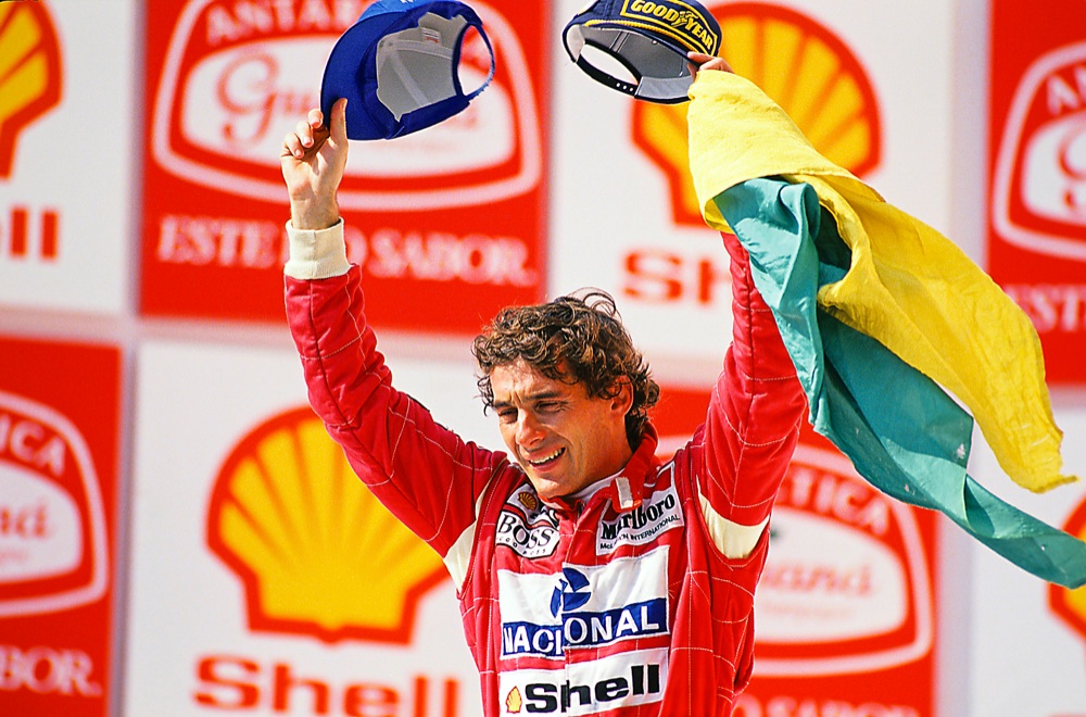 Monza, 1992. In uno dei pochi trionfi di una stagione avara, Senna sventola la bandiera brasiliana davanti ai tifosi dopo la vittoria davanti a Brundle e al giovane Michael Schumacher.