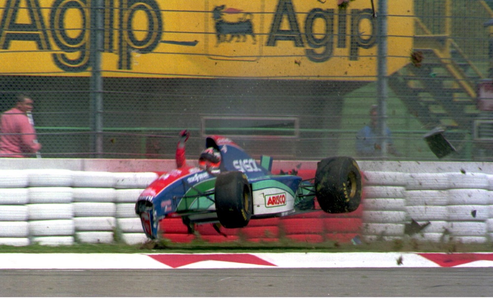 la gara, considerando anche i due giorni di prove, sarà quella con il maggior numero di incidenti nella storia della F1. Comincia il venerdì Rubens Barrichello. La sua Jordan decolla letteralmente alla Variante Bassa, finendo contro le reti di protezione e cappottandosi più volte. Nella foto, la monoposto di Barrichello nel momento dell’impatto durante le prove del venerdì.