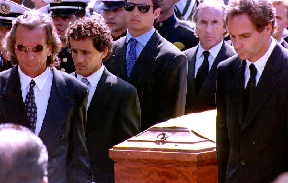 Nella foto: il rivale di sempre Alain Prost accompagna il feretro di Senna. Accanto a lui si riconoscono Gerald Berger, Emerson e Christian Fittipaldi, Jackie Stewart.