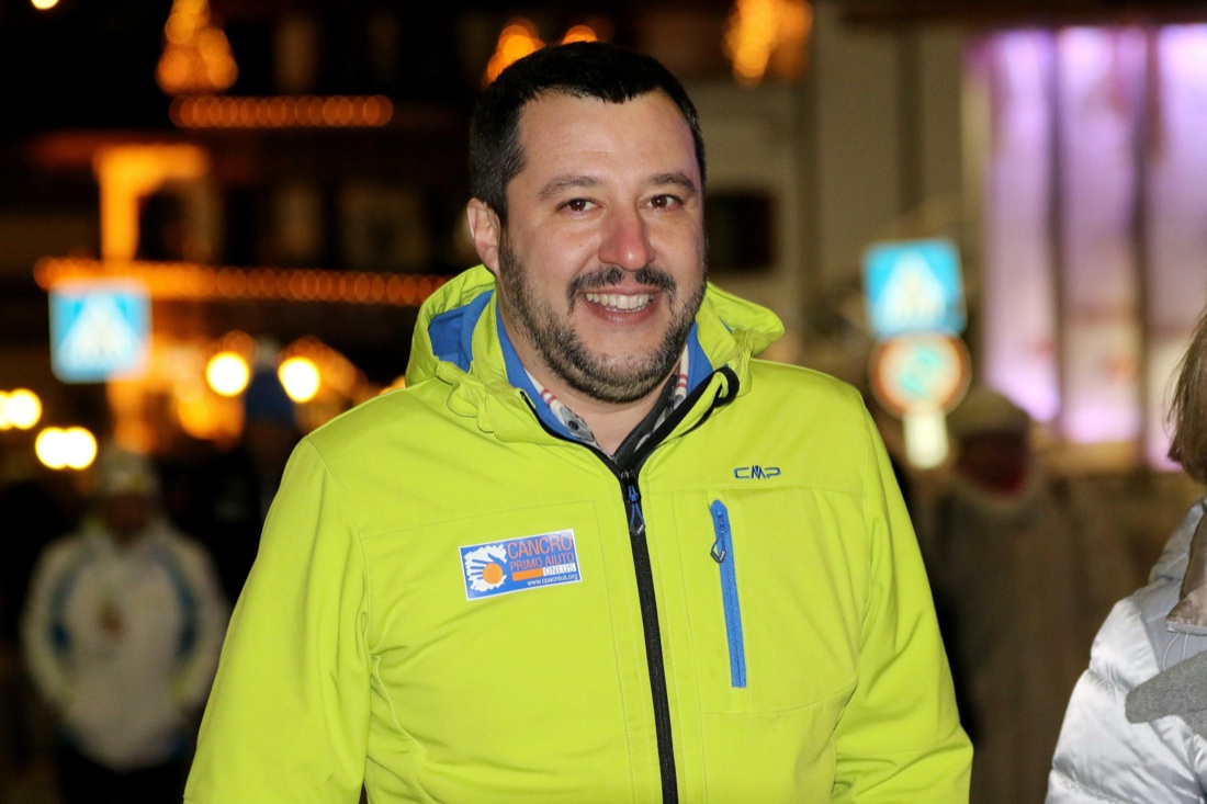 Il segretario federale della Lega Nord, Matteo Salvini, a margine della gara di Coppa del Mondo di sci alpino a Madonna di Campiglio (Trento), 22 dicembre 2016.