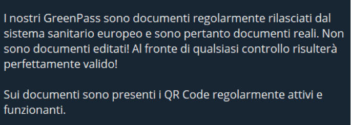 Secondo i truffatori, i documenti emessi sono reali e rilasciati da enti preposti: la “promessa” è che i loro clienti verranno registrati all’interno del sistema sanitario e risulterebbero quindi regolarmente vaccinati. Il GreenPass rilasciato dai truffatori avrebbe una durata che varia dai 6 ai 9 mesi e secondo quanto dichiarato nel canale Telegram non c’è rischio di essere scoperti o incappare in denunce sottolineando come i documenti emessi siano “reali” e pertanto muniti di QR code attivo e scansionabile. Inoltre, sembrerebbe che, come nel caso di un “vero” GreenPass, il documento rilasciato sarà possibile visualizzarlo tramite l’app Immuni o AppIO.