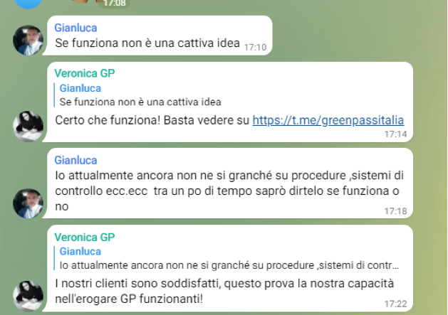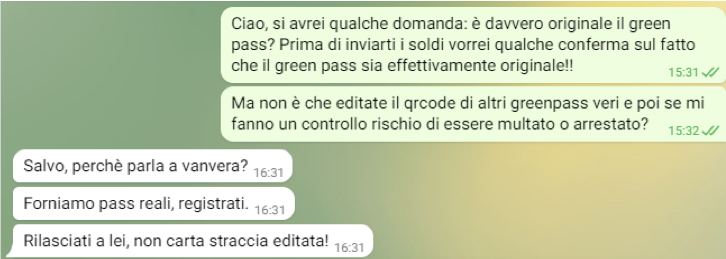 Abbiamo provato a contattare il venditore/truffatore su Telegram cercando di avere maggiori informazioni sulla genuinità del Green pass emesso. Queste le sue risposte: