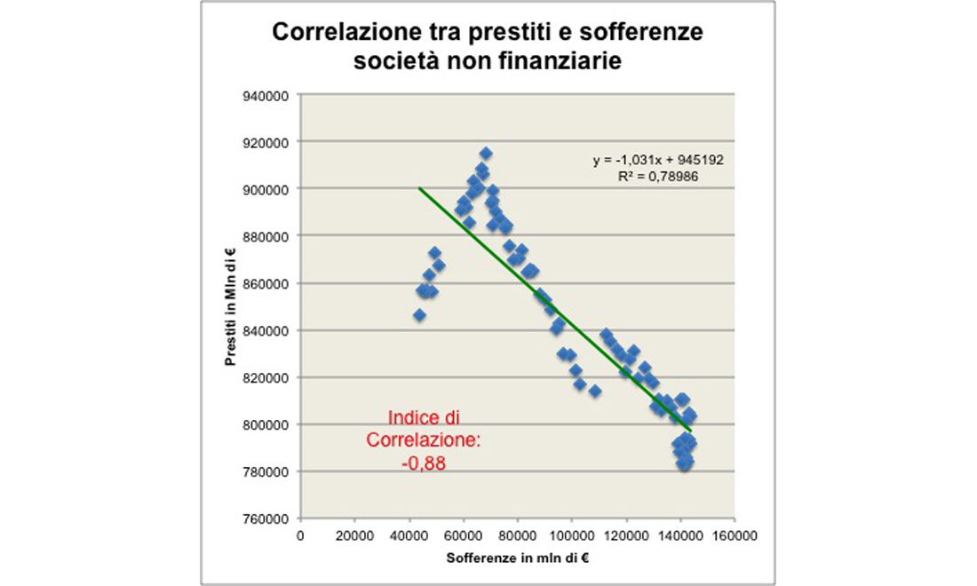 L’indice di correlazione è pari a -0,88: all’aumentare delle sofferenze verso le imprese, diminuiscono in modo praticamente proporzionale i prestiti alle stesse.