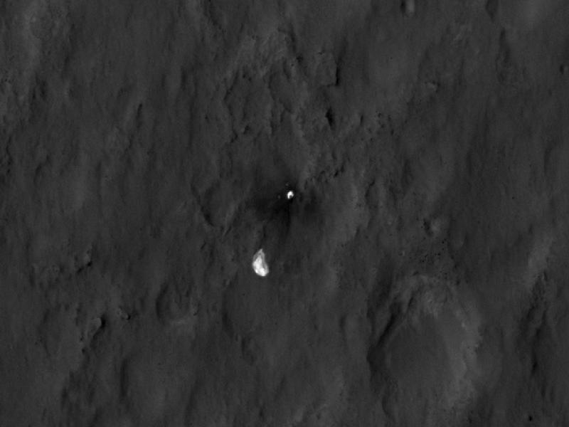 Il rover Curiosity circondato dai resti di scudo termico, paracadute e gli le altri componenti che hanno accompagnato e permesso la ‘morbida’ e ‘spettacolare’ discesa del rover su Marte: sono tutti visibili in un’unica immagine ripresa dalla sonda Nasa Mars Reconnaissance Orbiter (Mro) in orbita attorno al pianeta rosso, 24 ore dopo la discesa di Curiosity.