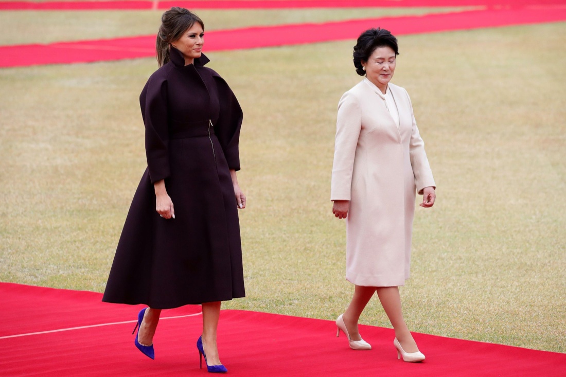 Melania Trump, décolleté blu elettrico Louboutin e ampio soprabito (dell’ atelier Del Pozo) color prugna dal taglio orientale strutturato, si è intrattenuta con la First Lady coreana, con la quale ha visitato gli slendidi giardini Nokjiwon di Seoul e fatto vista ad una scolaresca