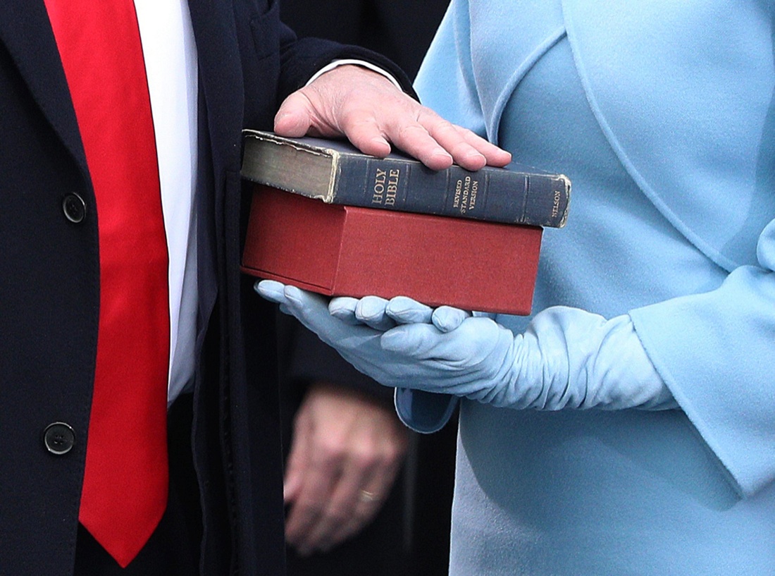 Il giuramento di Donald Trump su due Bibbie. In primo piano, i guanti celesti di Melania. Washington, 20 gennaio 2017