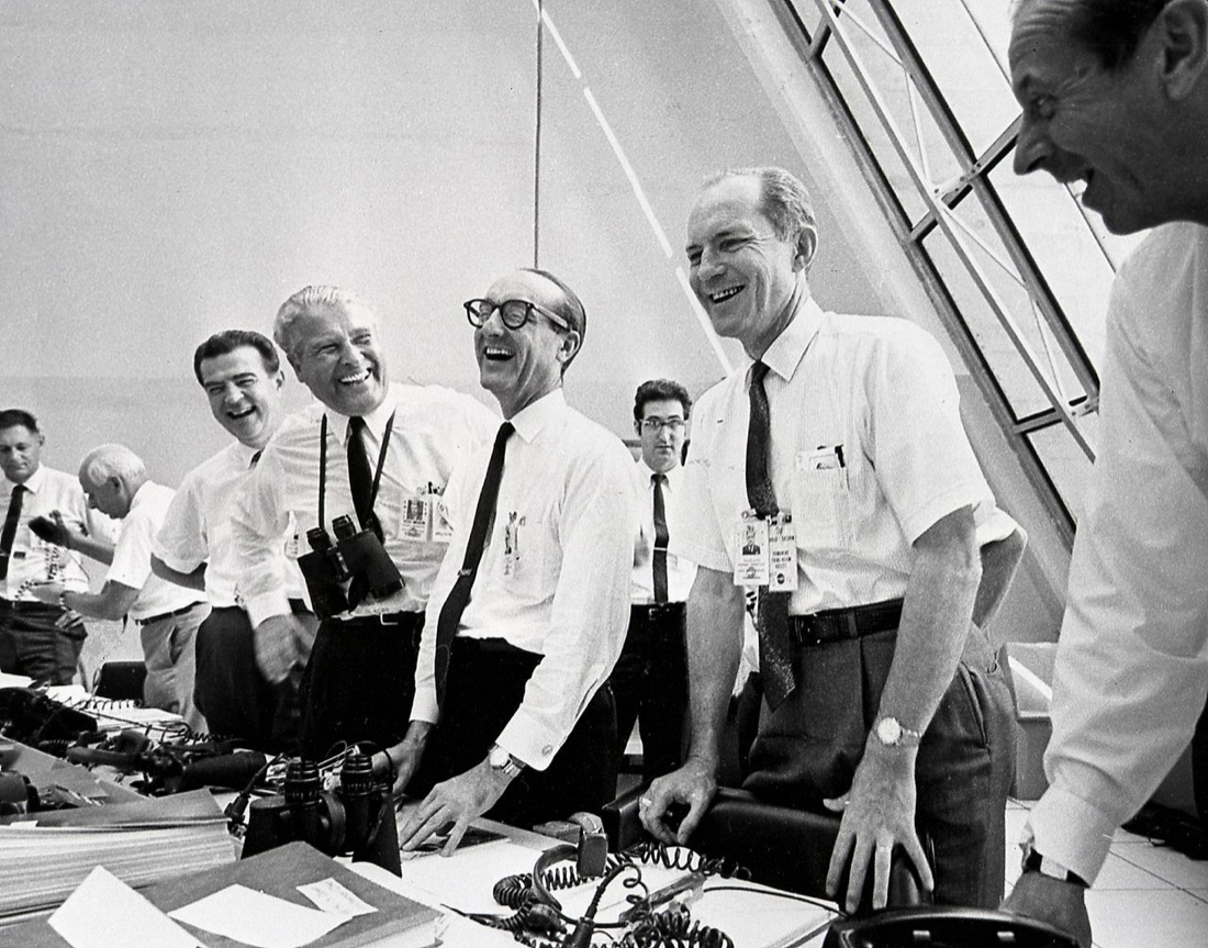 Charles W. Mathews;. Wernher von Braun, George E. Mueller e il Generale Samuel C. Phillips, festeggiano il successo del lancio dell’Apollo 11 il 16 luglio 1969