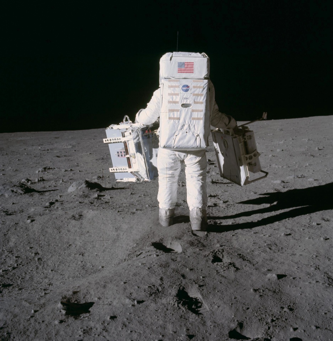 Buzz Aldrin con gli strumenti scientifici fotografato da Neil Armstrong