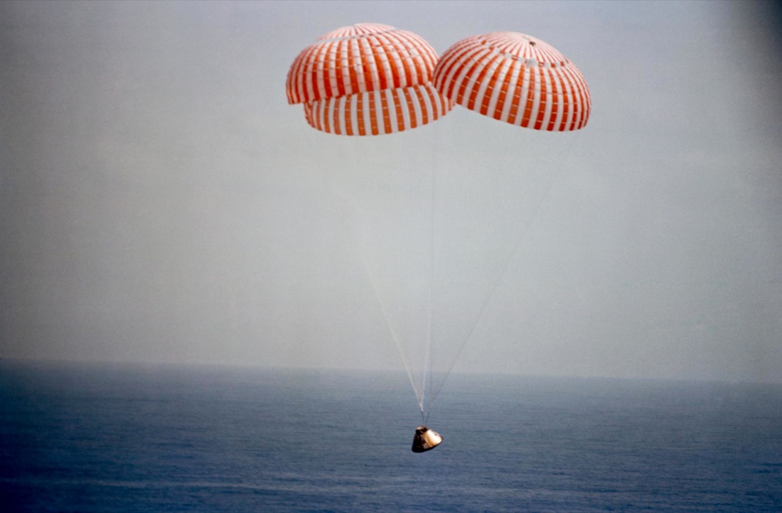 Il modulo di comando con i paracadute aperti poco prima dell’ammaraggio nel Pacifico il 24 luglio 1969