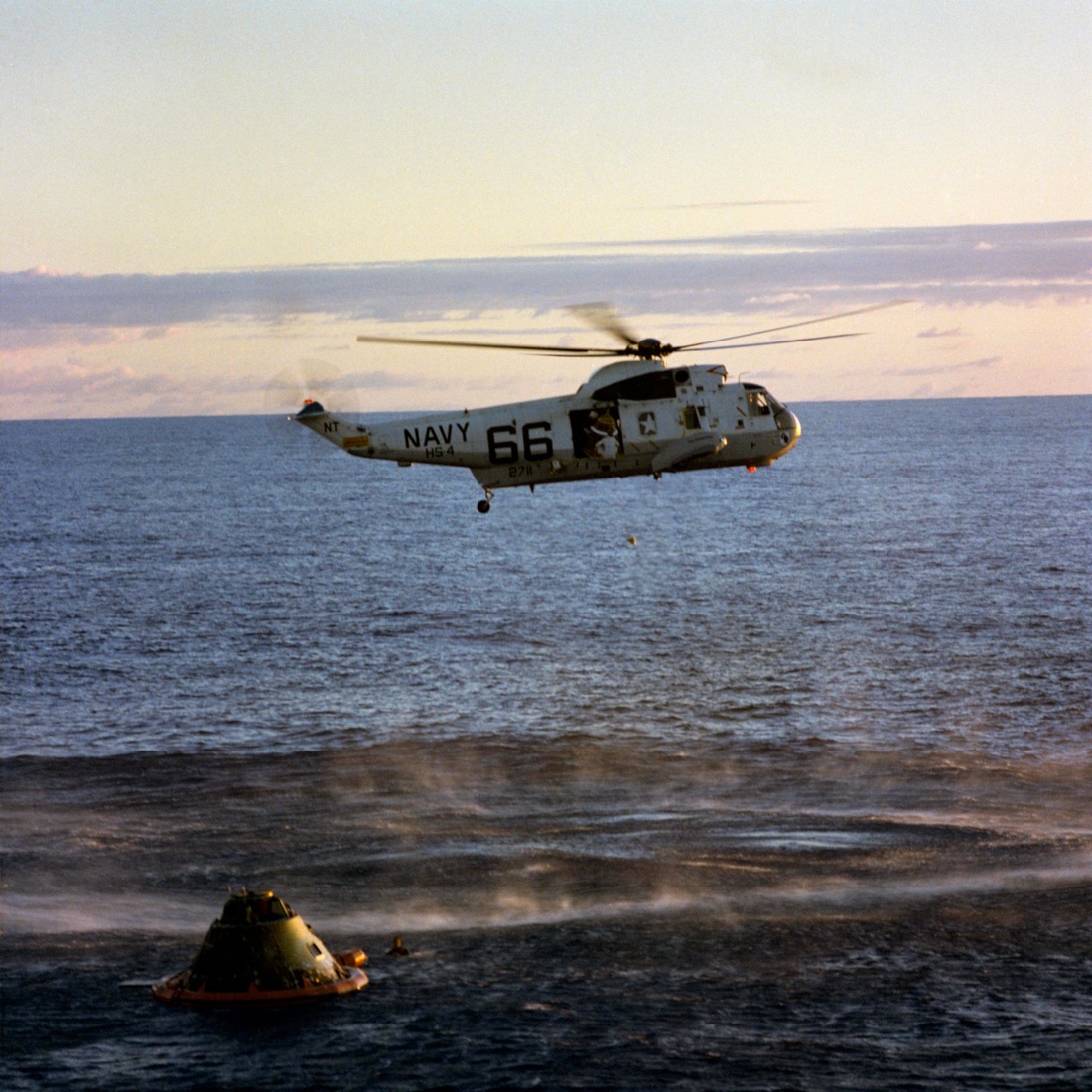 Il Sikorsky della Marina Americana atterra sulla USS Hornet dopo aver recuperato l’equipaggio dell’Apollo 11. 24 luglio 1969