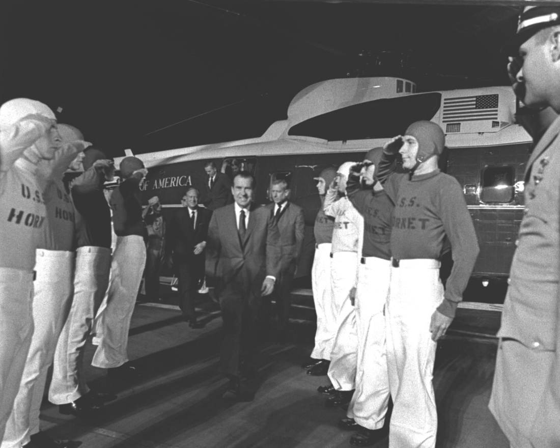Il Presidente Richard Nixon arriva a bordo della USS Hornet per il recupero degli astronauti. 24 luglio 1969