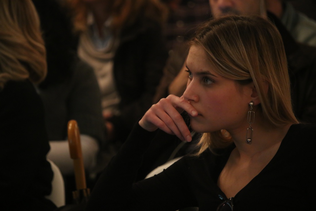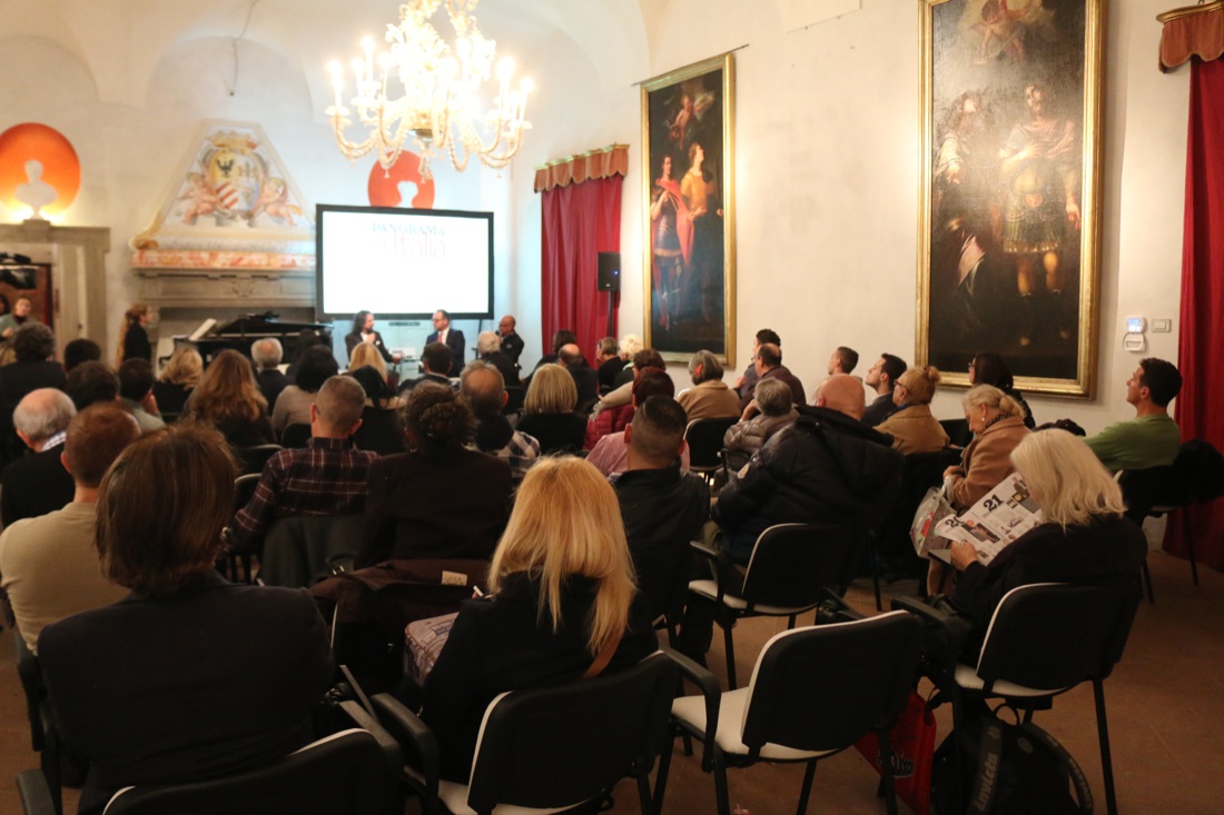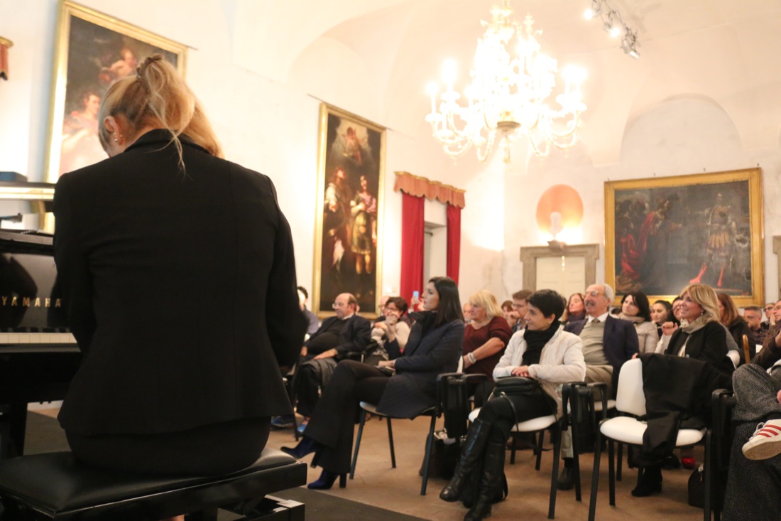Il pubblico di Panorama d’Italia a Milano alla presentazione del libro di Alfonso Signorini: “Fryderyk e George, storia di due anime”. Di spalle la pianista Marianna Tongiorgi.