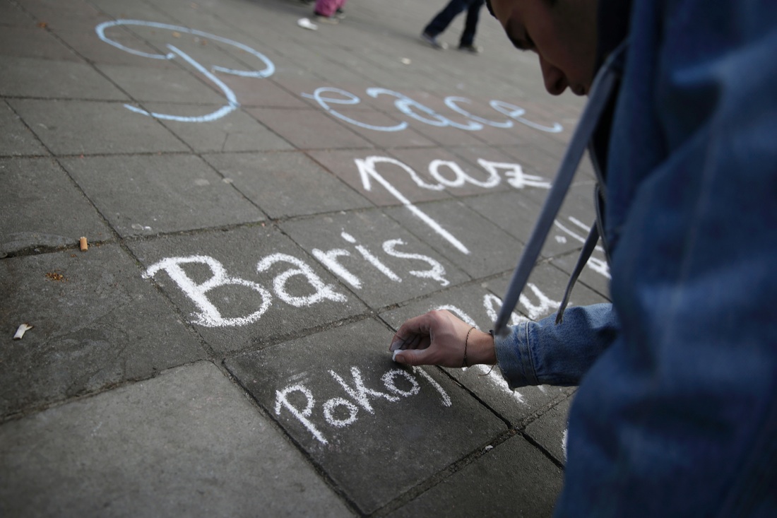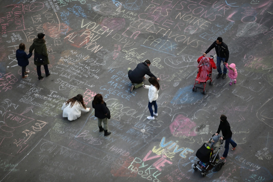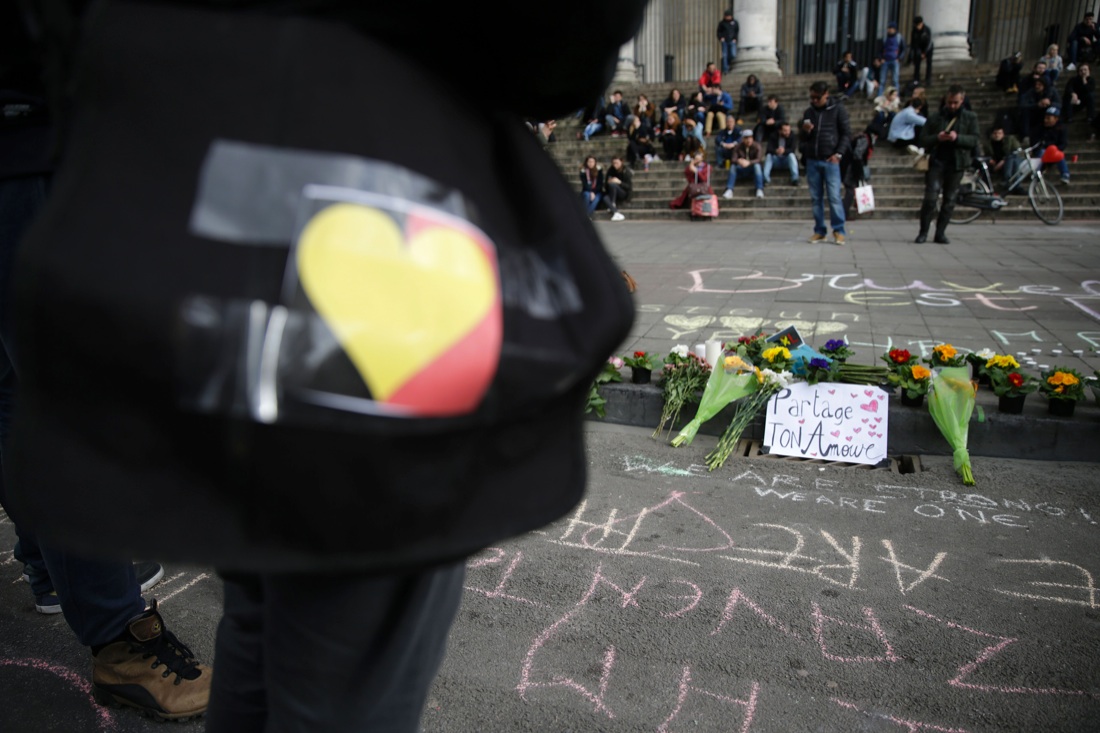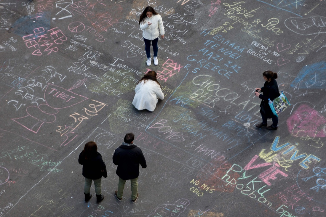 Bruxelles, 22 marzo 2016: scritte col gesso sull’asfalto di Place de la Bourse per commemorare le vittime delle stragi
