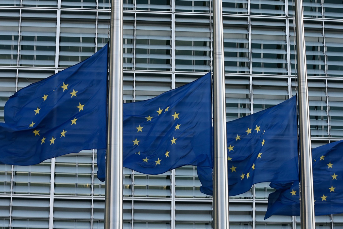 Bruxelles, 22 marzo 2016: bandiere dell’Unione Europee a mezz’asta davanti alla sede della Commissione