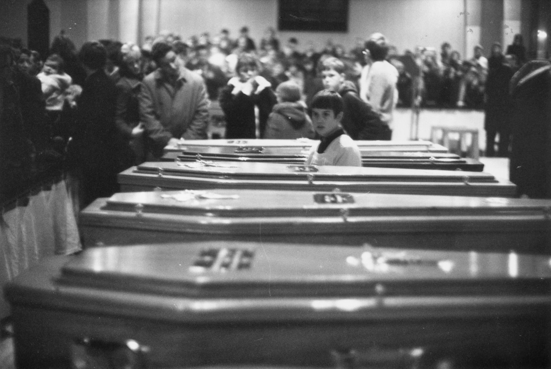 2 febbraio 1972. Derry, St.Mary’s Church. I feretri delle 13 vittime della “Bloody Sunday”. Uno dei feriti gravi morirà poco dopo, facendo salire il bilancio.