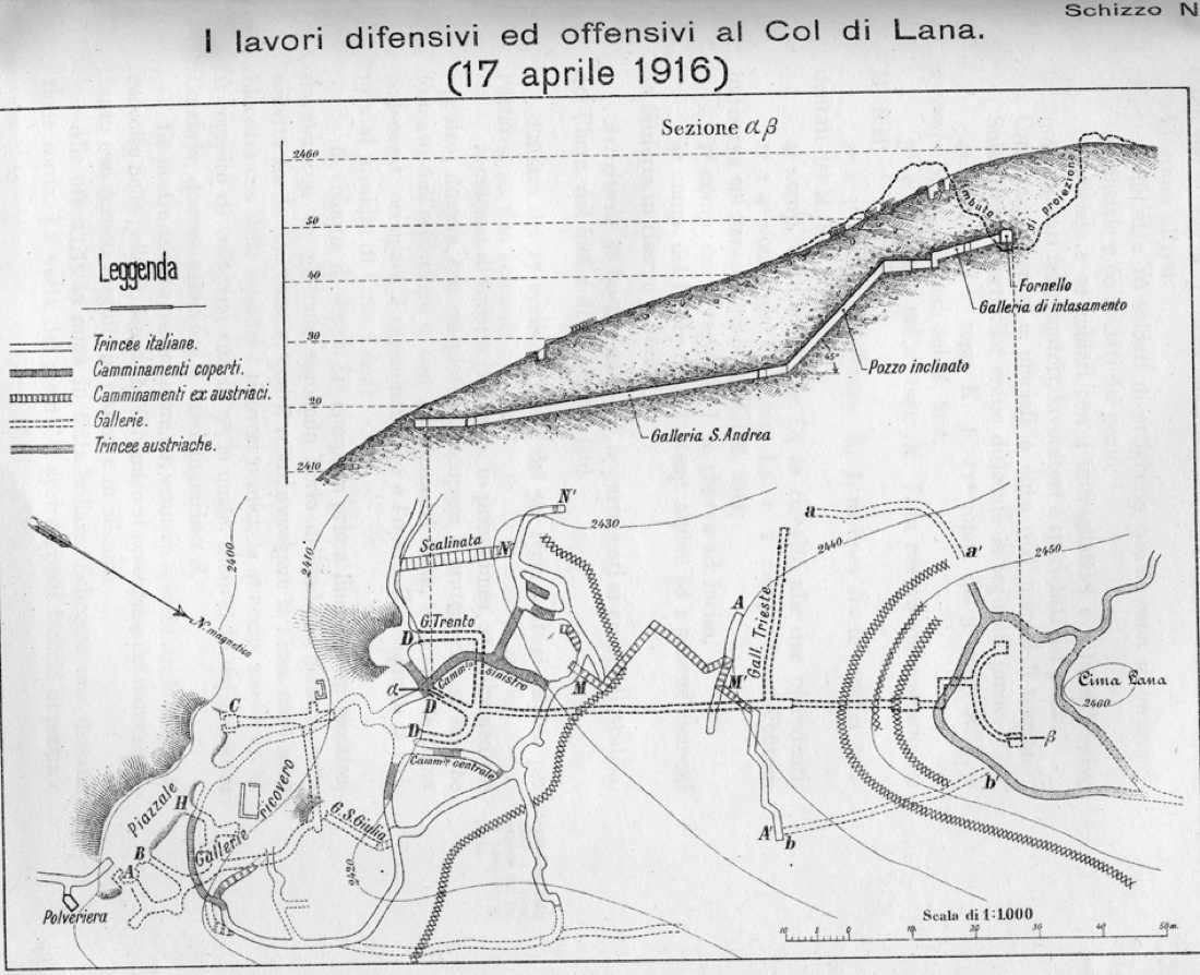 Schema dei lavori di scavo italiani con la galleria di S.Andrea dalla quale fu fatta esplodere la grande mina dell’aprile 1916.