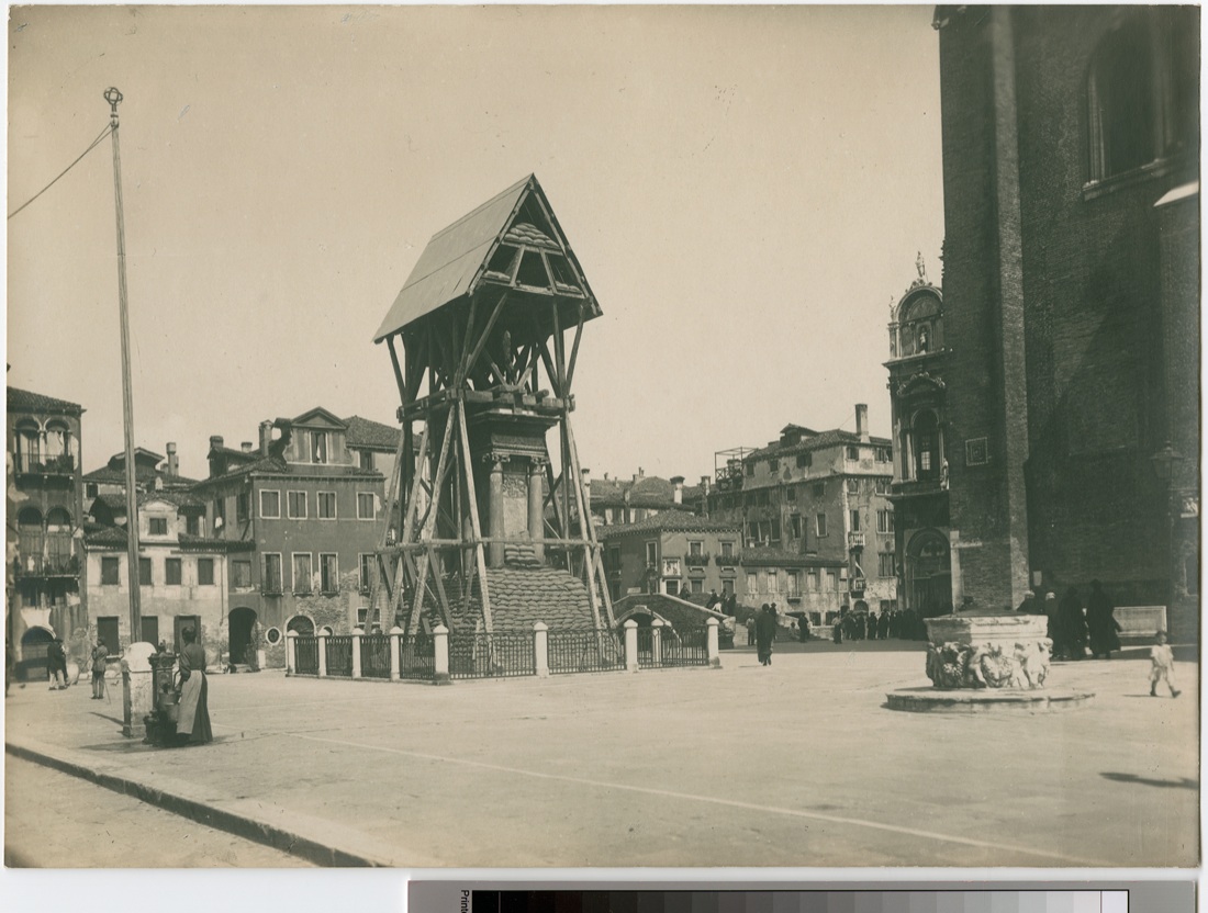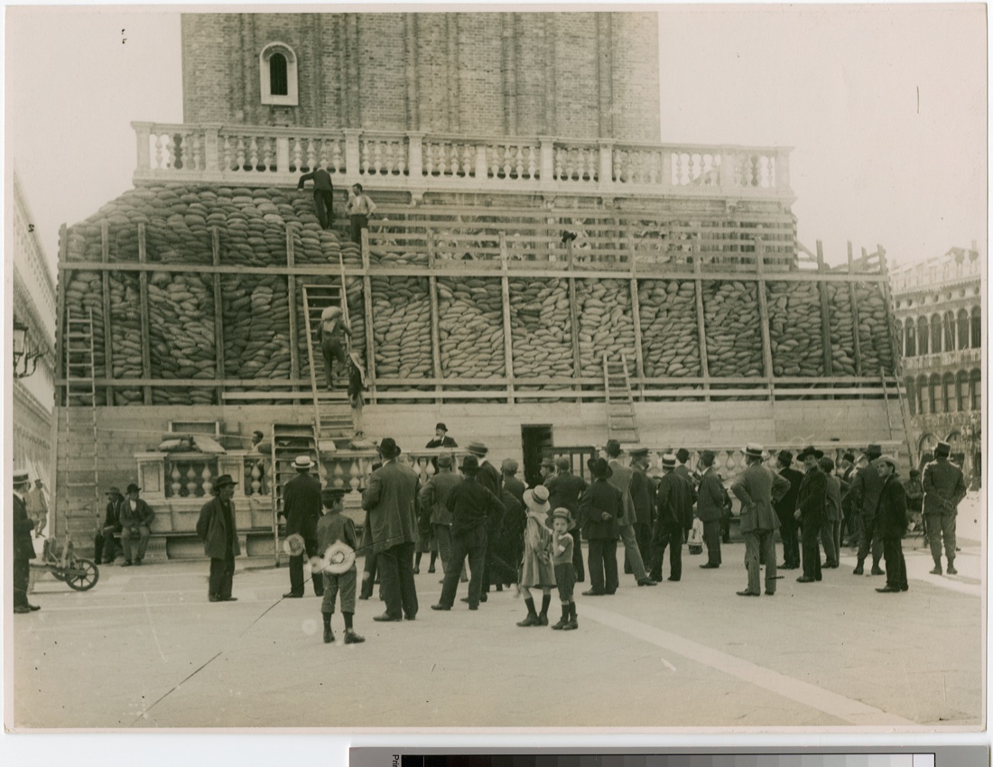 Campanile di San Marco. La loggetta del Sansovino viene ricoperta e protetta con sacchi di sabbia