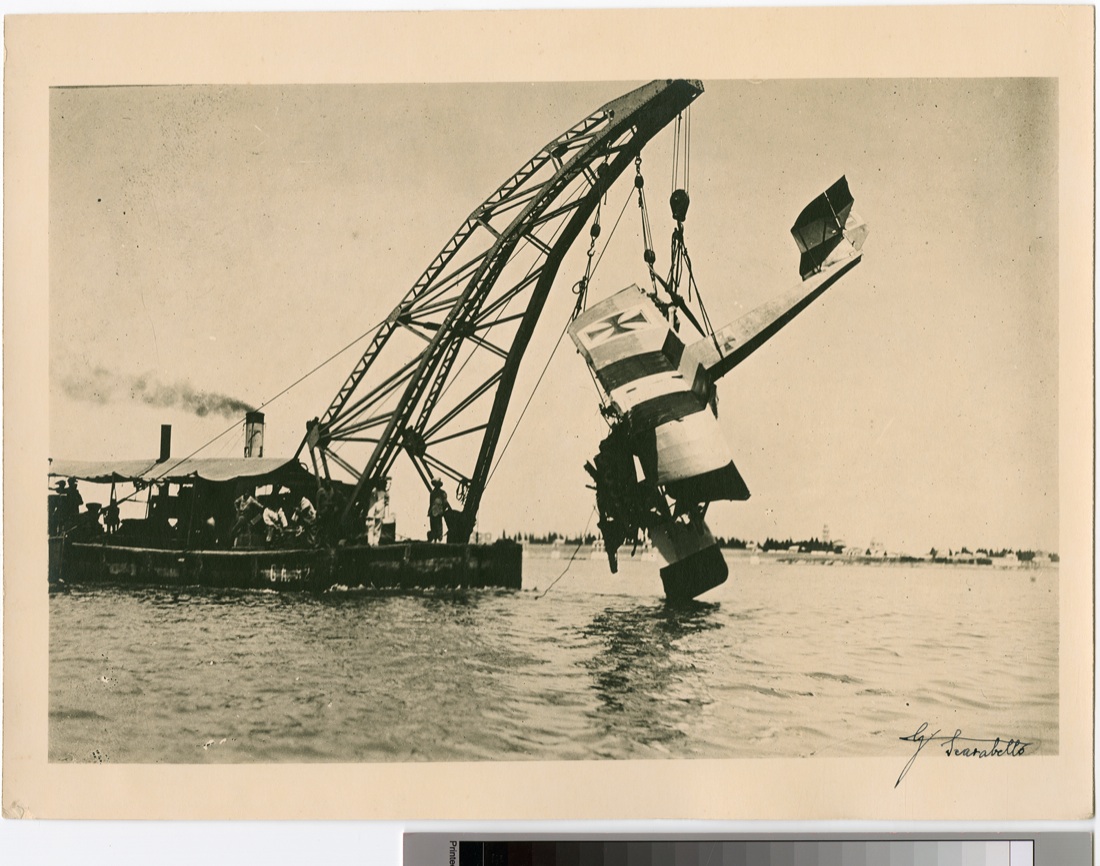 Foto di Giovanni Scarabello. L’epilogo dell’incursione aerea. Il recupero dell’idrovolante austriaco K. 228 colpito dalla difesa antiaerea italiana e caduto in laguna presso il Casino degli Spiriti.