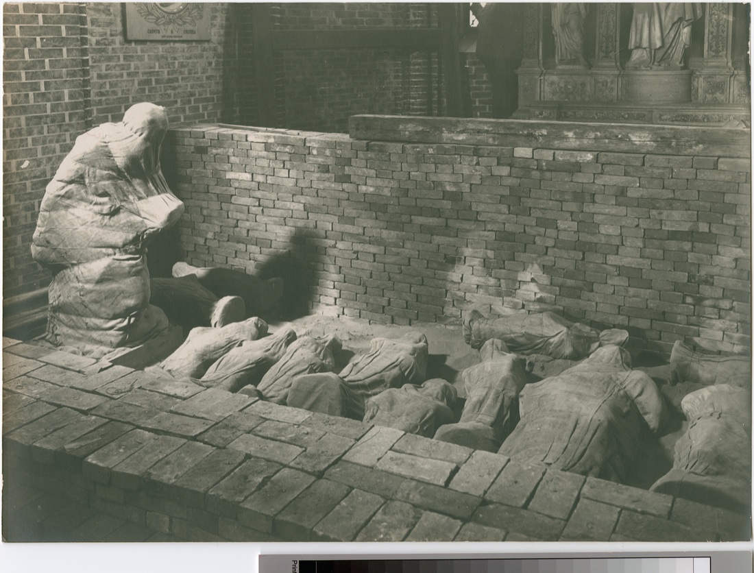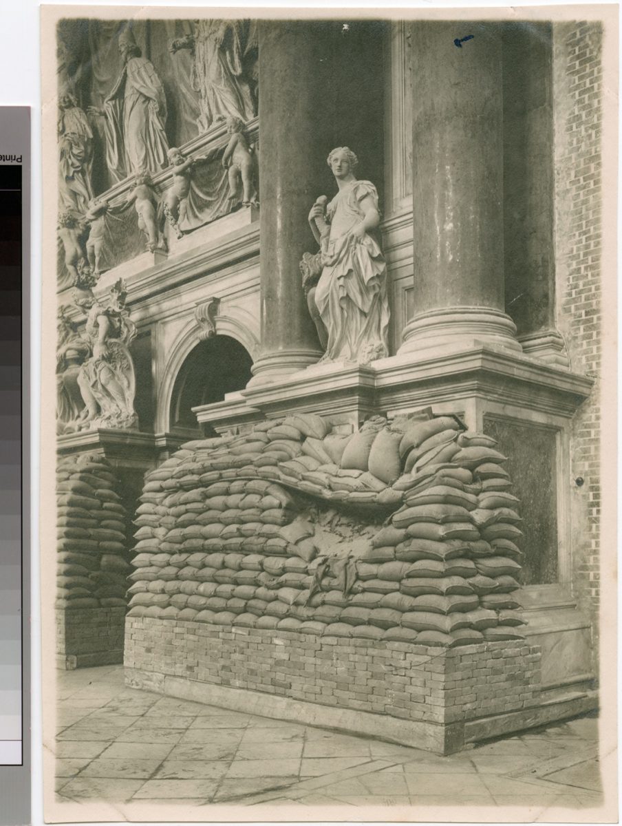 Chiesa dei SS. Giovanni e Paolo. Effetti di una scheggia di bomba contro le saccate di sabbia a difesa del monumento Valier.