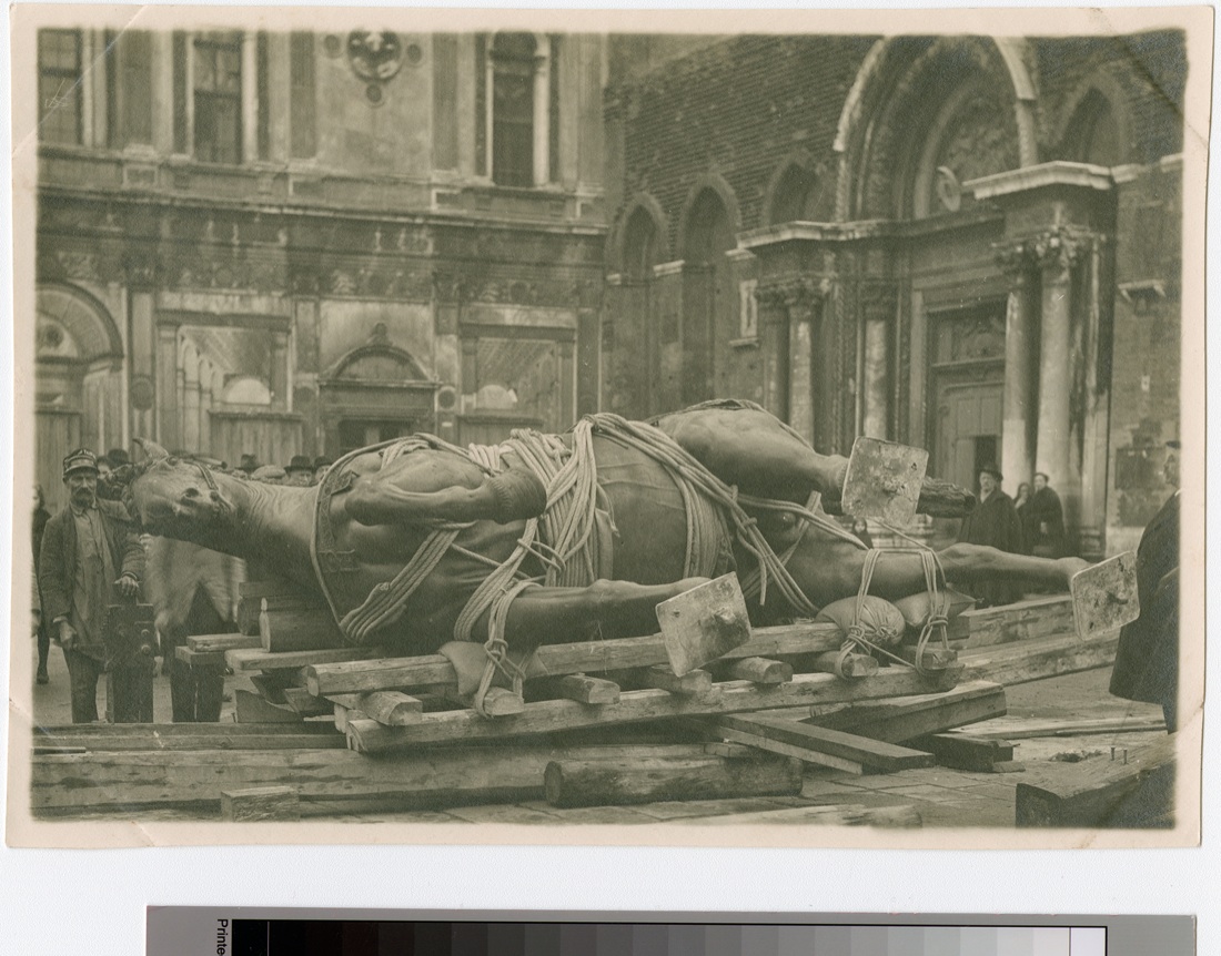 Venezia.Trasporto del monumento a Bartolomeo Colleoni in Campo S.S. Giovanni e Paolo. Particolare del cavallo separato dal condottiero.