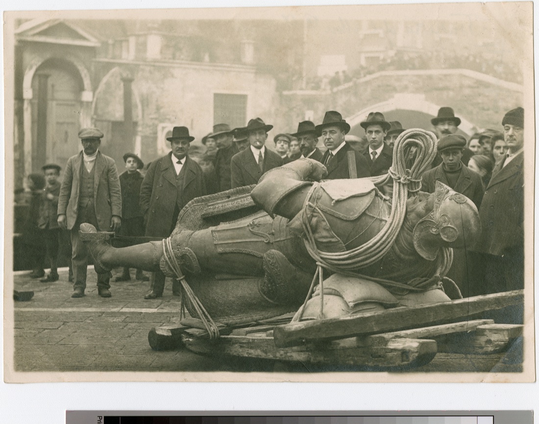 Venezia. Il Commissario Arduino Colasanti, Ispettore Generale dei Monumenti, assiste allo smontaggio e al trasporto del monumento a Bartolomeo Colleoni