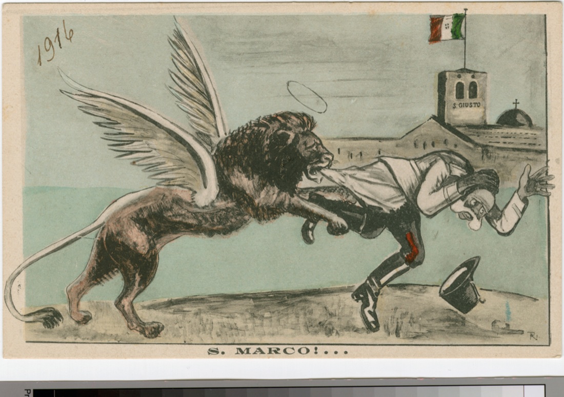 Cartolina satirica. “S. Marco!…” Il Leone di San Marco morde Francesco Giuseppe Imperatore dell’Austria -Ungheria