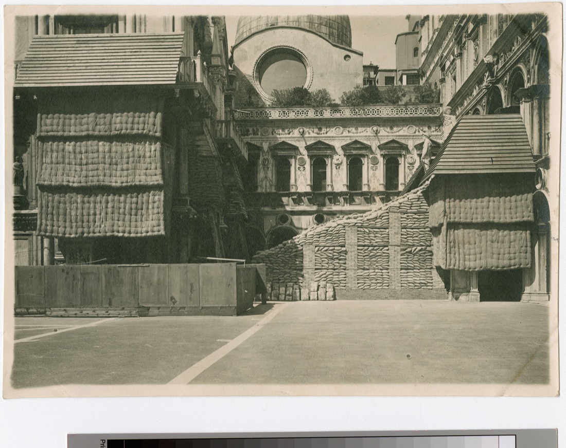 Palazzo Ducale. Costruzione delle fortificazioni su una delle facciate interne al Palazzo e la Scala dei Giganti ricoperta dai sacchi di sabbia.