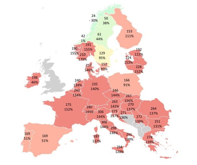Prezzi medi annuali dell’elettricità nel mercato del giorno prima e differenze su base annua UE27/EEA e Svizzera.