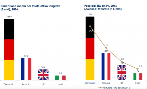 Qualche numero: i nostri primi 10 gruppi per capitalizzazione hanno un fatturato di 84 miliardi di euro, meno di un decimo della top ten tedesca (767 miliardi), un quarto di quelli francesi (327 miliardi) e metà di quelli britannici 180 miliardi.