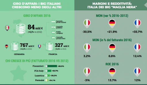 Una fotografia con poche luci e tante ombre, si diceva. A partire dal fatturato delle prime dieci multinazionali italiane quotate:in calo del 5,3% sul 2015 e addirittura del 17,4% sul 2012. Il confronto con Germania, Francia e Regno Unito è impietoso.