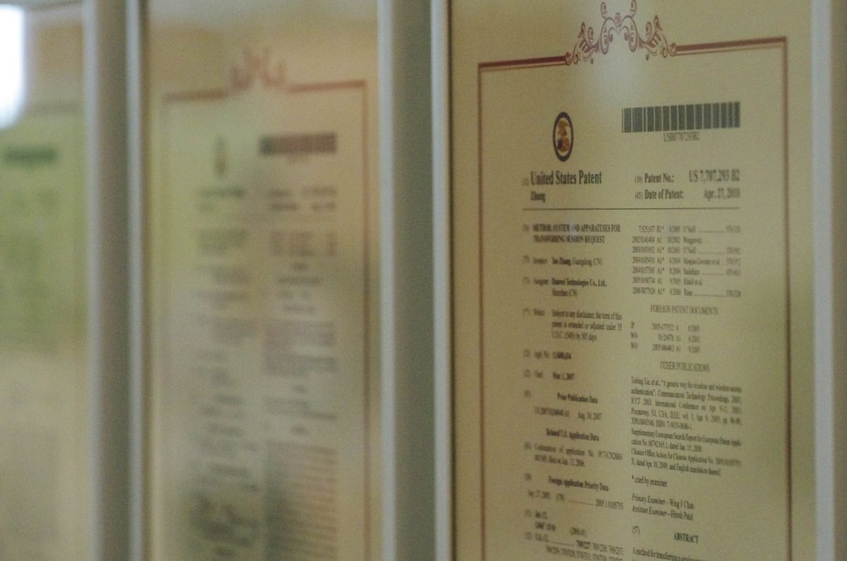 Uno dei tanti brevetti affissi all’ingresso del quartier generale di Huawei, a Shenzhen